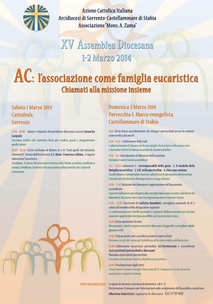 La nostra Azione cattolica diocesana sta promuovendo in questo periodo le assemblee parrocchiali, la prima fase di questa stagione assembleare che ci vedrà impegnati poi, nei prossimi mesi, nei momenti diocesano (1-2 marzo 2014), regionale (29-30 marzo 2014) e nazionale (30 aprile-3 maggio 2014).