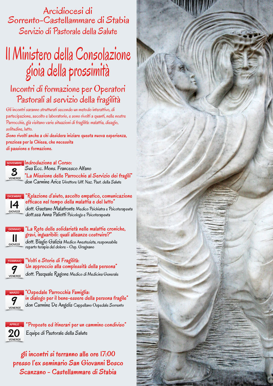 Il Corso Il Ministero della Consolazione, gioia della prossimità, si rivolge a quanti, nelle nostre Parrocchie, già visitano, nelle famiglie, negli ospedali e nelle strutture residenziali, diverse situazioni di fragilità: malattia, solitudine, disagio, lutto; ed è rivolto anche a chi desidera iniziare questa nuova esperienza, preziosa per la Chiesa, per la quale occorre passione e formazione.