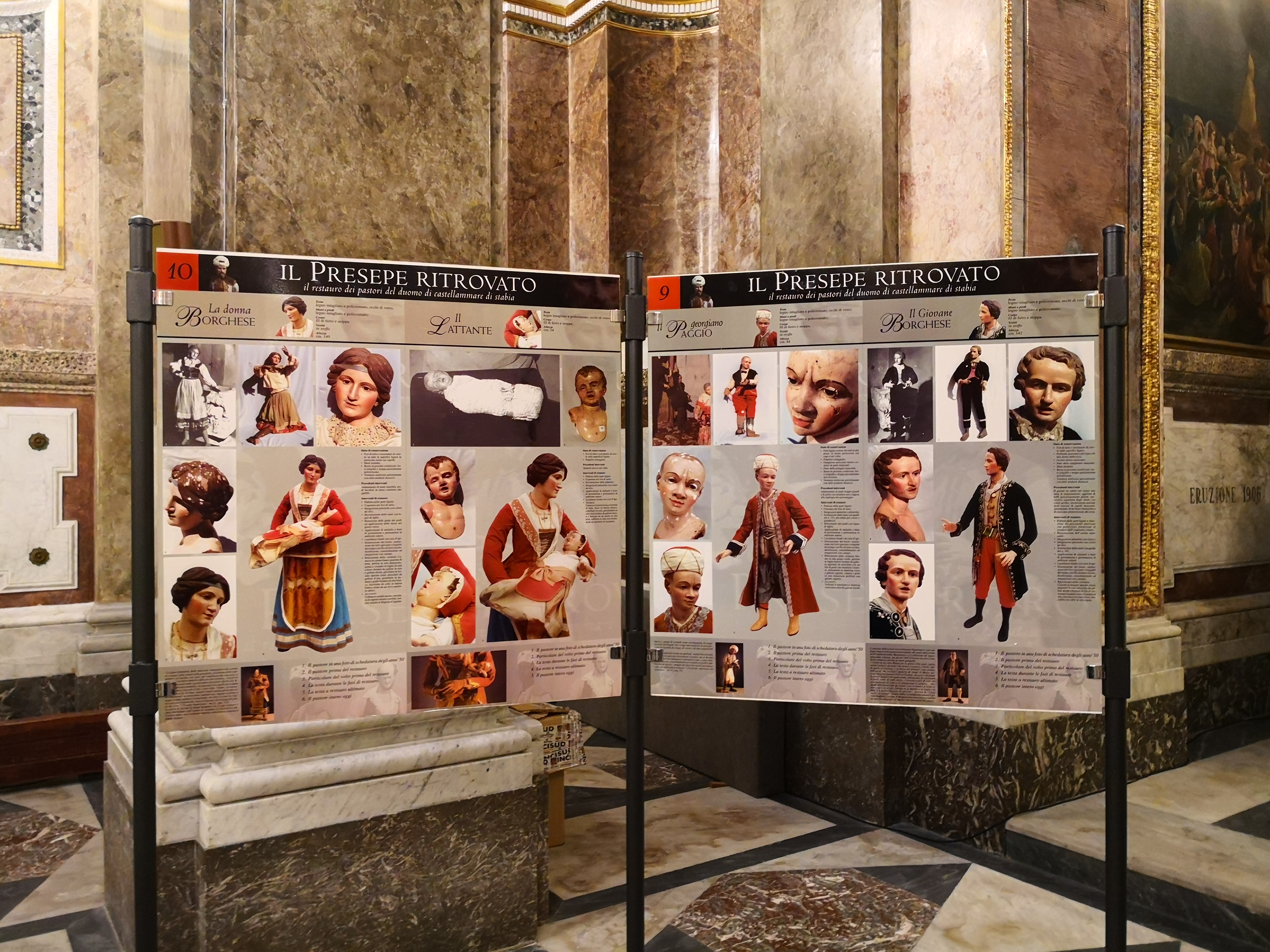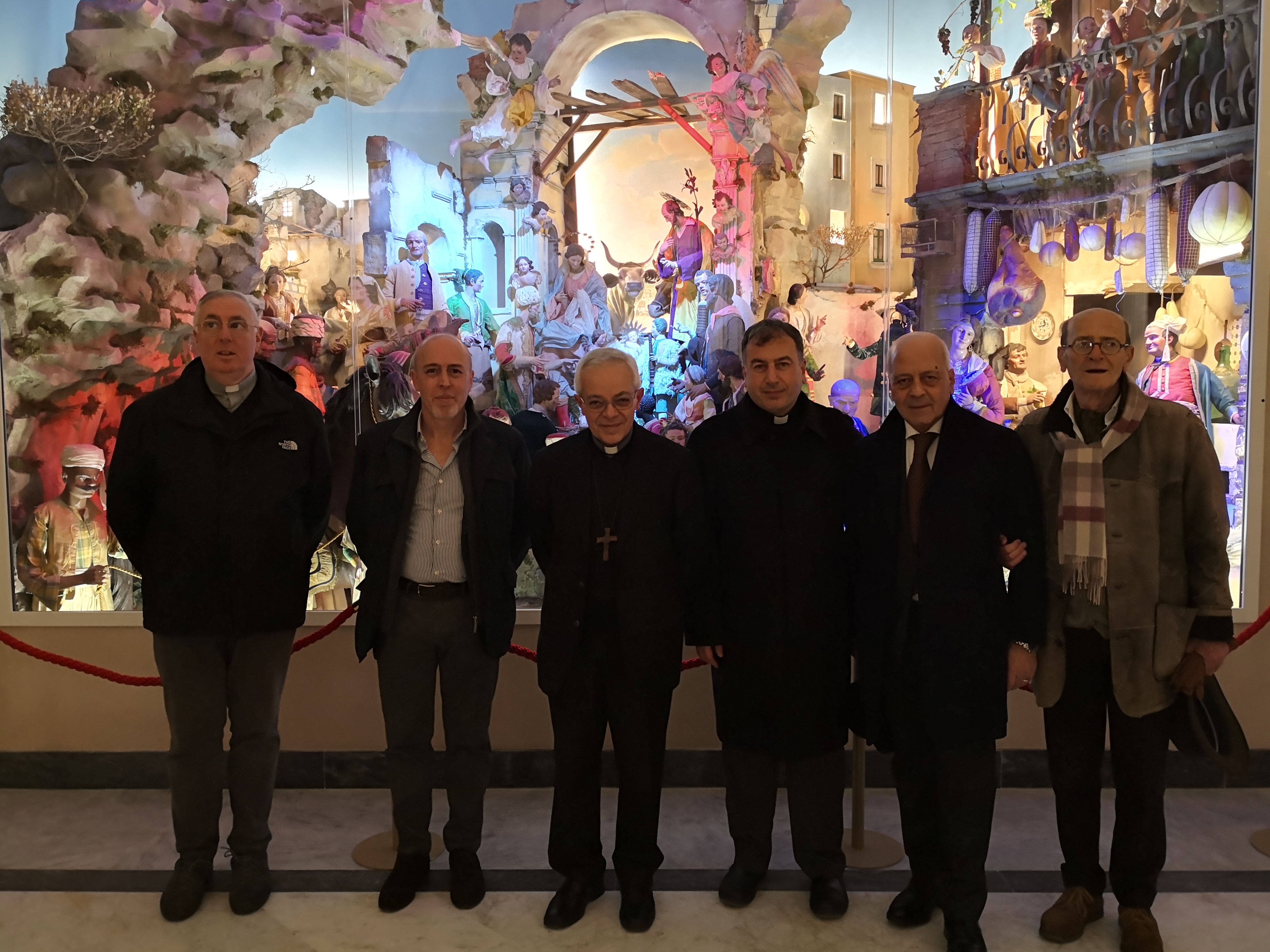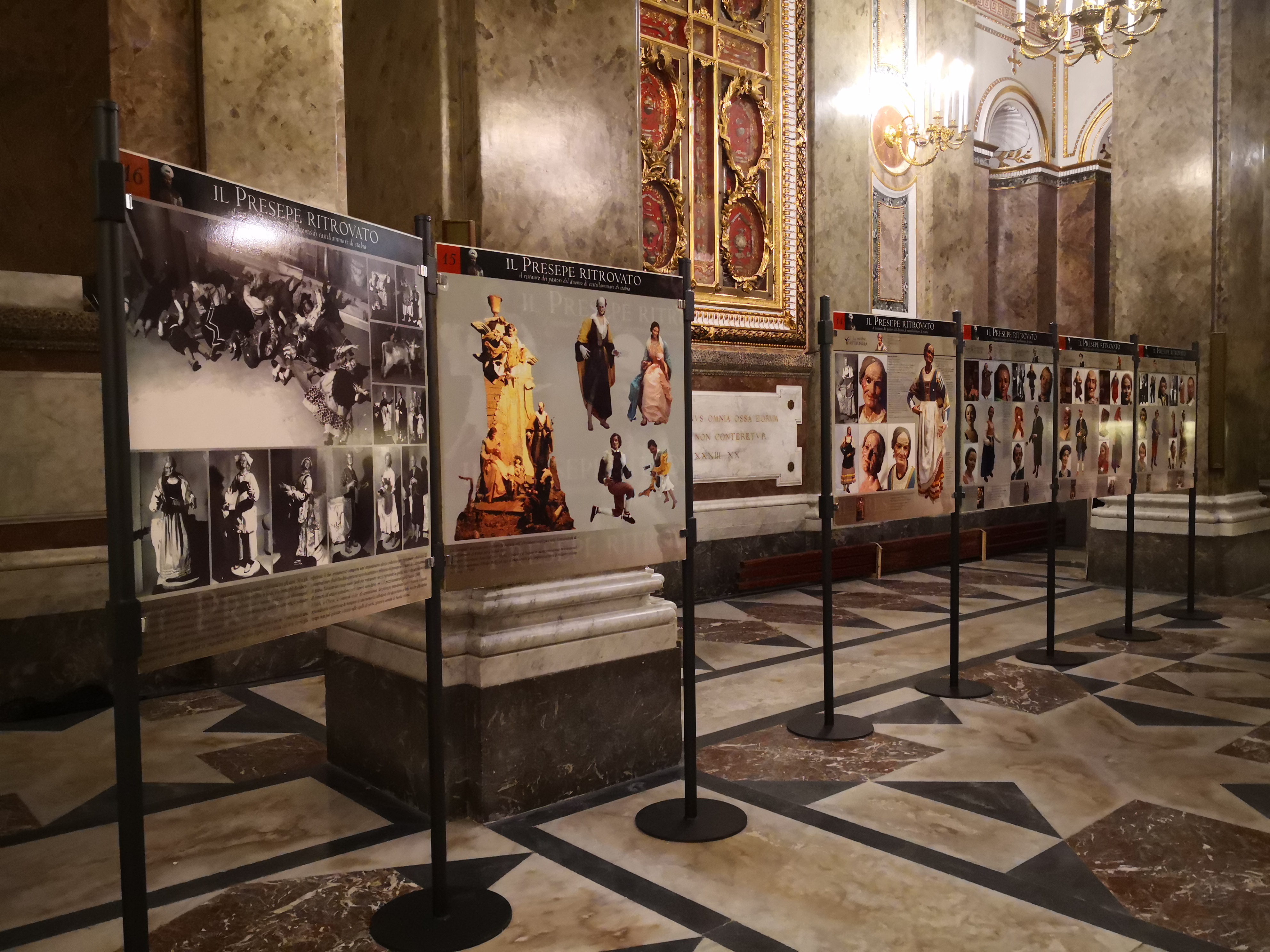 L’esposizione presepiale è costituita da due distinte scenografie: l’annuncio ai pastori e la natività. La prima è stata collocata nell’atrio sulla parete di fondo rispetto all’ingresso, la seconda è posta nella sala capitolare sulla parte di fondo rispetto all’accesso. L’atrio e la sala capitolare, sono anche luogo di esposizione di altri beni culturali mobili già presenti nelle aree di intervento. Spicca l’adorazione dei pastori di Jusepe de Ribera.