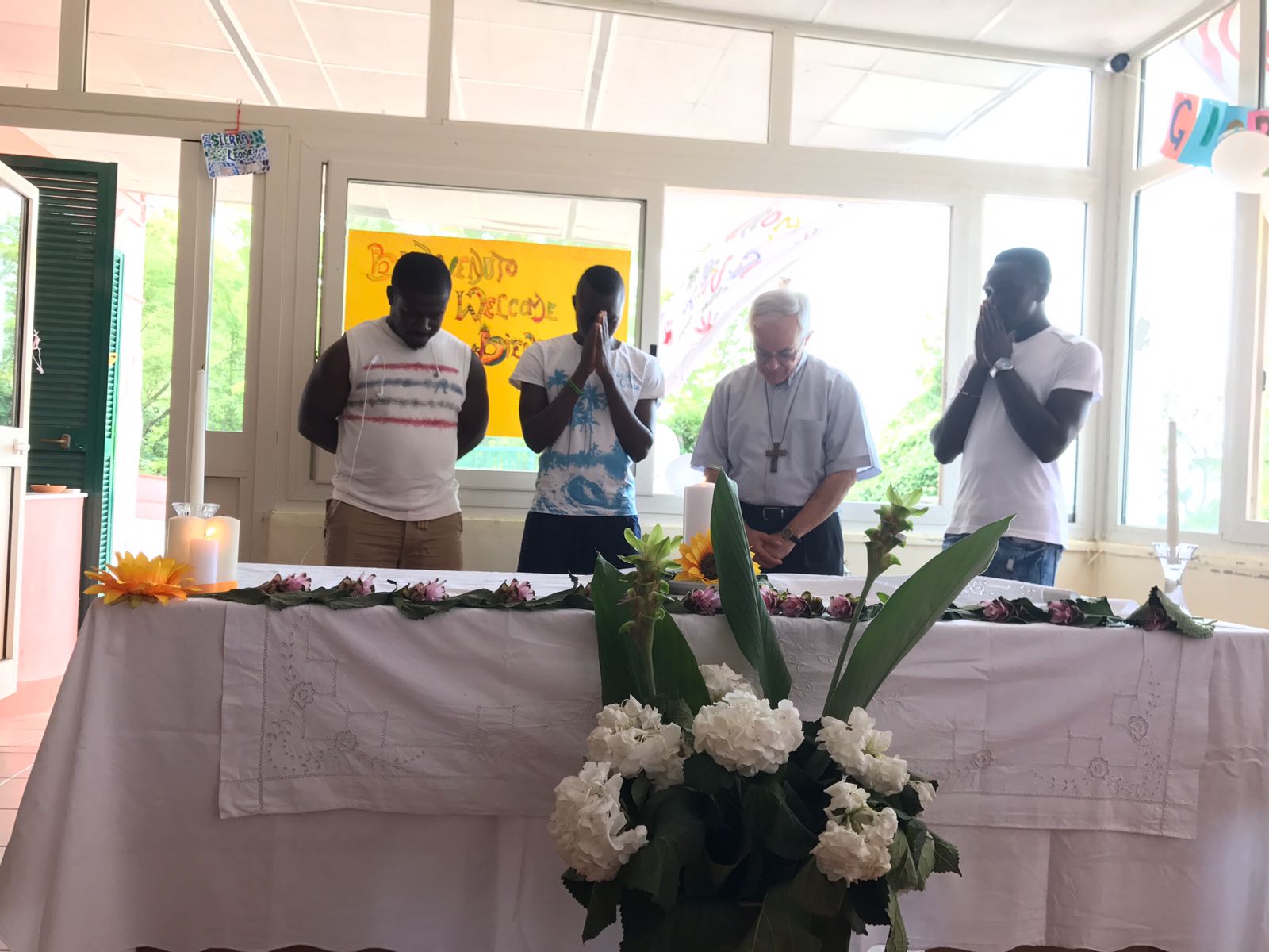 ; Il vescovo ha poi invitato i ragazzi ad esprimere i loro pensieri e le loro preghiere. Dopo un momento di timore, ognuno di loro ha ringraziato per questo momento, ha pregato per le sofferenze che ha vissuto nel loro viaggio, per la loro famiglia, per quelli che vivono le loro stesse sofferenze, ha ringraziato per quello che hanno trovato, per la grande famiglia che li ha accolti e ha ricordato in maniera molto toccante le vittime del mare, un ragazzo ha invitato tutti a recitare il Padre Nostro, cè stato la preghiera di un versetto del corano, sulla scia di questi intensi momenti di preghiera, alcuni ragazzi, hanno chiesto a sua Eccellenza di ricevere il sacramento del Battesimo.
