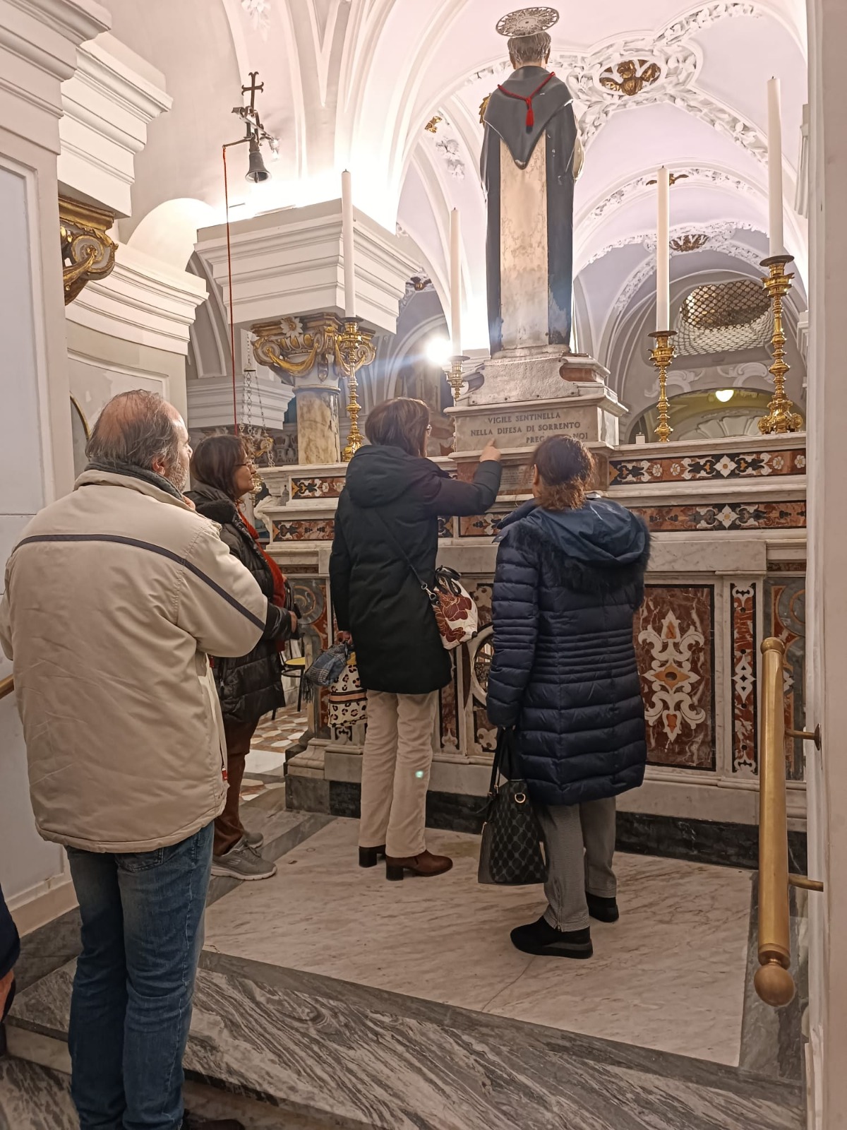 Secondo e ultimo momento dell’incontro è stata la visita guidata della Basilica, testimonianza artistica e culturale della fede e della devozione dei sorrentini, ma soprattutto segno della presenza paterna di Dio riservata a tutti noi, particolarmente da 1400 anni per intercessione di S. Antonino, il quale per non lasciare soli i suoi fratelli chiese di essere sepolto: “né dentro, né fuori la città”!