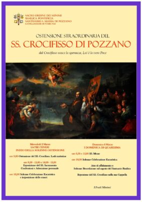 “Il Crocifisso per la pace” è l’iniziativa che il Rettore della Basilica di Pozzano P. Gian Franco Scarpitta, assieme al Confratello Padre Federico Rubino intende realizzare a da Mercoledì 2 Marzo (le ceneri) fino a Domenica 6 con l’esposizione del famoso Crocifisso di Pozzano sull’altare maggiore della Basilica stessa, o ai fini di ipostatizzare l’amore di Gesù per la pace e il suo desiderio che abbia fine l’incubo dei bombardamenti in Ucraina, per la serenità del popolo oppresso e costretto alla fuga.