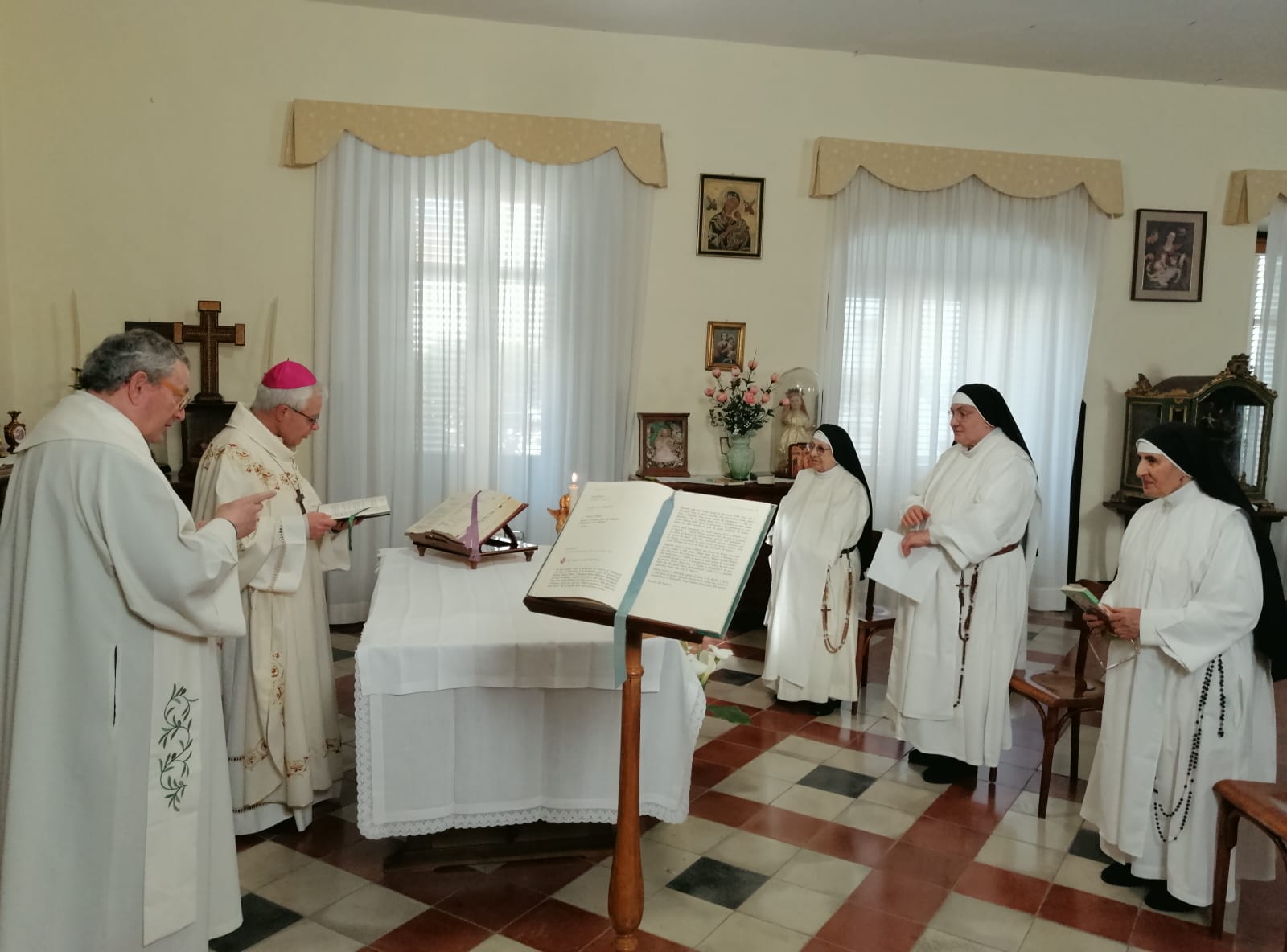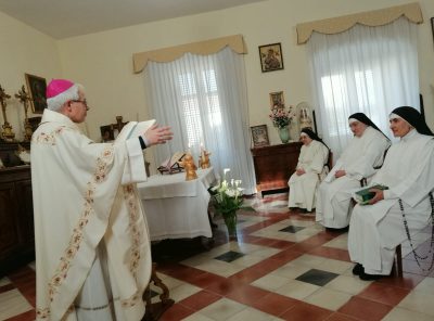 Pur sentendo la mancanza della Messa quotidiana, è stato per noi di grande consolazione seguire il Santo Padre nella celebrazione eucaristica di ogni mattina, nel Triduo Pasquale e tutti gli altri momenti di preghiera, anche quelli che ha visto la nostra Chiesa unita nell’invocazione a Maria. La visita del nostro Arcivescovo il giorno di venerdì in albis è stato per noi un momento di grazia. La sua presenza e la celebrazione eucaristica che ha voluto donarci, ancora una volta ci ha fatto sentire pietre vive della nostra chiesa locale e ravvivato la nostra vocazione claustrale come cuore orante e offerta viva, così come voluta dal nostro Fondatore San Domenico su Guzman.