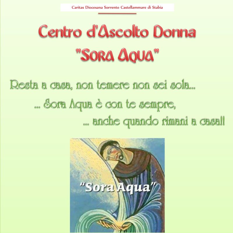 • Il Gruppo di “SORA AQUA“, sostenuto dalla Caritas Diocesana, con un Equipe di Psicologhe si è adoperato e si adopera con grande disponibilità a creare contatti di ASCOLTO per le donne che subiscono violenza nel  territorio di Castellammare: sappiamo che questo periodo di obbligata e lunga convivenza nelle famiglie è un momento in cui spesso si scatenano impensabili violenze.