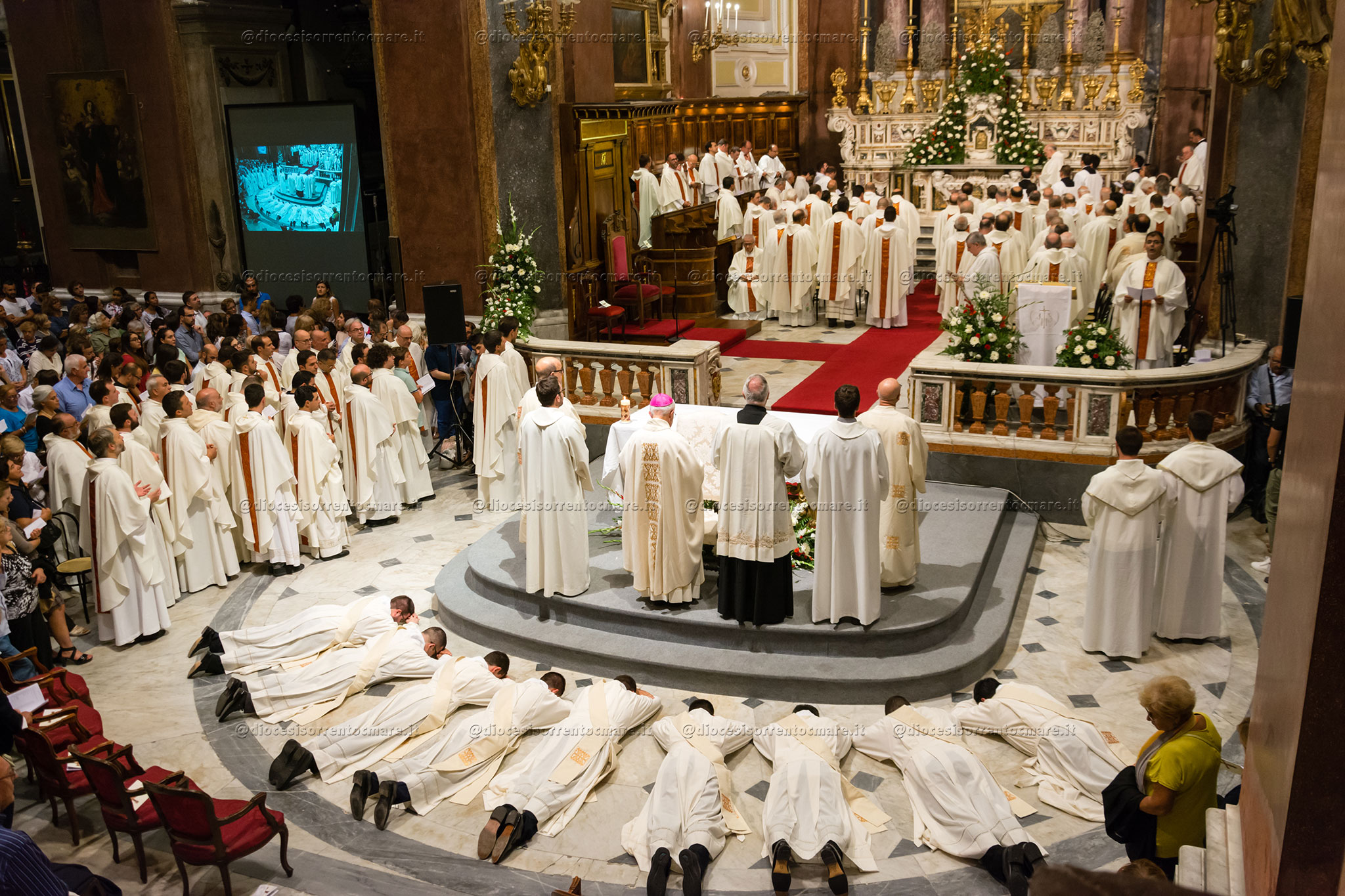 Una folla di gente, una concattedrale con migliaia e migliaia di persone pronte a gioire e far festa per i nove nuovi presbiteri dellArcidiocesi Sorrento Castellammare di Stabia. Michele Afeltra, Alfonso Benfatto, Filippo Capaldo, Christian Cicirelli, Antonio DUrso, Michele Inserra, Enzo Meglio, Gianluigi Persico e Vincenzo Vitiello, hanno detto il loro sì. Si sono chinati alla chiamata del Signore e durante la celebrazione, emozionati tra sorrisi e lacrime, hanno ricevuto il rito. Un rito pieno di momenti significativi e simbolici che permettono di capire quanto sia importante la presenza di un pastore allinterno di una comunità e quanto lui sia pronta a lasciare sé stesso per dedicarsi completamente al prossimo.