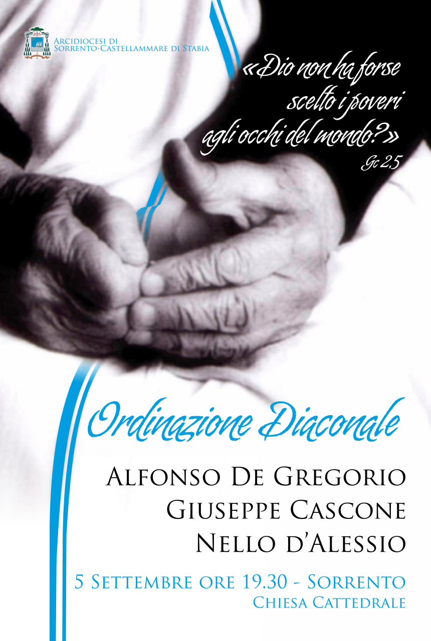 La nostra Chiesa è in festa. Sabato 5 settembre, infatti, il nostro arcivescovo, mons. Francesco Alfano, ordinerà diaconi Nello dAlessio, Giuseppe Cascone e Alfonso De Gregorio. La celebrazione si svolgerà nella cattedrale di Sorrento, alle ore 19:30.