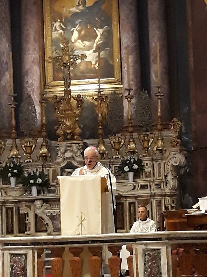 “Maria, madre dolcissima, ci accostiamo a te con confidenza di figli, consapevoli che l’amore materno scandaglia le profondità del cuore, e senza troppe parole capisce e compatisce, e continua a dirci, anche senza parole: coraggio! vi sto accanto! non vi lascerò mai soli! Nella vita a Nazareth, tu hai sperimentato come noi l’importanza degli affetti, la forza dell’amore, la tenerezza di uno sposo che ti ha amata più di se stesso, la gioia di un figlio che cresceva in te e con te, per poi abbracciarti e chiamarti “mamma”. Hai gustato la gioia della festa, la pace del tramonto che avvolgeva di calda luce le povere case di Galilea, prima della notte in cui il tuo sguardo si perdeva nel cielo stellato, primo stellario posto sul tuo capo dalla mano del Creatore. Con le gioie, anche tu hai sperimentato, le prove della vita, le fatiche della casa, la preoccupazione per il futuro, per il lavoro di Giuseppe, per il pane quotidiano. Il tuo cuore più volte fu come trafitto dalla spada del dolore, per il tuo figlio, lontano, sempre pronto a fasciare in cuori feriti, ma a sua volta ferito e ucciso dalla cattiveria degli uomini. Quanto dolore, per lui e per noi! Tu sei come noi, avendo calpestato questa terra, con tutto ciò che contiene; ma, di questa terra, Tu sei anche la creatura più bella, perché hai creduto, hai amato, hai sperato! Ti sei fidata di Dio, della sua parola, delle sue promesse, sei stata la tela immacolata sulla quale il Padre, per mezzo dello Spirito Santo ha impresso per sempre il volto del Figlio, che più di ogni figlio somiglia a sua madre, tanto da non riuscire più a distinguere quanto tu hai dato a lui e quanto lui ha dato a te. Vergine Immacolata ti affidiamo la nostra Città, che da sempre ti onora, e fa’ che non ti porti solo impressa nel civico stemma, memoria di antenati credenti, ma ti porti soprattutto impressa nel cuore! Aiutaci a costruire una città fondata non sull’egoismo che uccide, ma sull’amore che edifica! Aiutaci Maria ad avere anche noi, un cuore immacolato, una mente attenta, e mani sporche e callose perché sempre all’opera nel cantiere mai chiuso del bene comune.