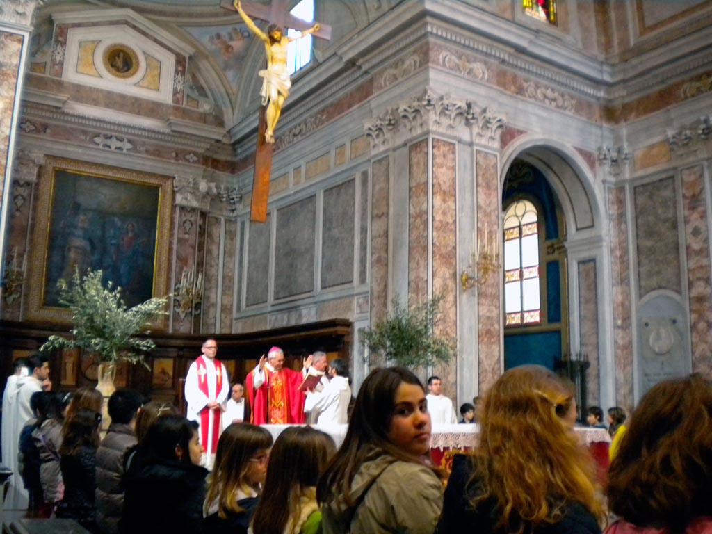 Domenica mattina. Il calendario segna 13 aprile 2014. Dunque, non una qualunque domenica, ma la Domenica delle Palme e della Passione del Signore. Sorrento si sveglia sotto la pioggia. Poi cè qualche schiarita. Secondo il programma definito dalla parrocchia della cattedrale la benedizione delle Palme con larcivescovo, mons. Francesco Alfano, dovrebbe avvenire in piazza Tasso. Il tempo resta incerto. Intorno alle 10 è già tanta la gente che gremisce la piazza per pregare insieme con il presule. Poi si sparge la voce: la benedizione delle Palme si farà sul sagrato della cattedrale. La folla, festante, bambini, genitori, nonni, con le Palme si è diretta in cattedrale, dove alle 10,45 larcivescovo ha benedetto gli ulivi e le Palme, invitando a seguire Gesù: Andiamo dietro a un Re mite, ma anche ad andare verso gli altri: Il Signore ci invia nel mondo, nelle periferie, per incontrare i nostri fratelli. Il nostro pastore ha anche ricordato che nella Domenica delle Palme si celebra la Giornata mondiale della gioventù a livello diocesano e che sabato, 12 aprile, cè stata la Pasqua dei giovani, a Lettere.