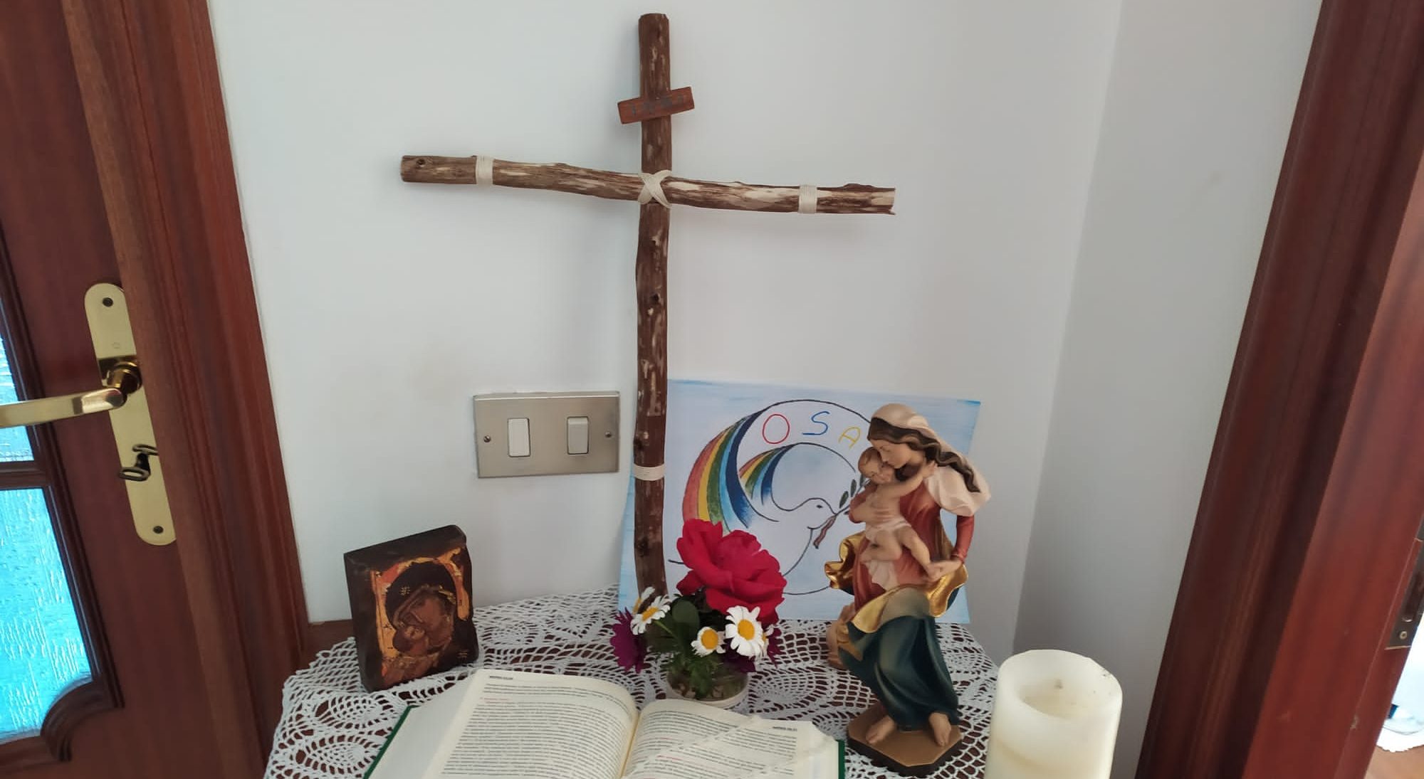 E’ stato bello vedere un padre che lava i piedi ai propri figli e alla propria moglie, ci siamo commossi enormemente. Poi è arrivato il venerdì santo, Gesù muore, abbiamo messo il nostro crocifisso velato al centro del nostro altare anzi della nostra mensa. Abbiamo celebrato la via crucis e adorato quella croce, il dolore di quella madre vissuta sotto la croce si è fatto sentire. E’ arrivato il silenzio, il tempo si è fermato, per aspettare la luce del Risorto.