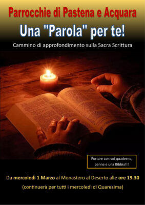 Per centrare sempre più la nostra vita sulla Parola di Dio e nella Parola di Dio, abbiamo iniziato mercoledì 1 marzo e si continuerà per tutti i mercoledì di Quaresima, al Monastero al Deserto, alle ore 19:30, un cammino sulla Sacra Scrittura: “Una Parola per te” per lasciarci leggere la nostra vita dalla Parola di Dio e per rendere la Parola di Dio la verità più profonda della nostra esistenza, siamo aiutati dal nostro parroco, da suor Maria Emmanuel e da suor Maria Luciana, ci aiutano a ricevere strumenti per stare sulla Parola e farla risuonare nella nostra vita!