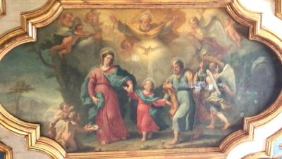 Oggi abbiamo bisogno di riscoprire questi “racconti” e valorizzarne gli insegnamenti, sia per il valore che hanno in sé sia per il messaggio che contengono dei nostri avi, che non hanno scelto a caso temi e scene, ma seguito un nesso causale, un leitmotiv. Così forse neppure gli esperti della soprintendenza si sono accorti che in posizione assolutamente preminente c’è una grande tela sul soffitto del transetto che è un vero gioiello: rappresenta la Sacra Famiglia dipinta da Nicola de Filippis nei primi anni del 1700. Subito colpisce per la quantità di scene di contorno che potremo definire l’album di famiglia, ma soprattutto per le tre figure centrali che dominano decisamente e, che per gesti e disposizione, sono un piccolo trattato di teologia. De Filippis era un sacerdote, conosceva la teologia e cercava di raccontarla nei suoi quadri… Non possiamo parlare di tutto. Fermiamoci alle tre figure centrali:
