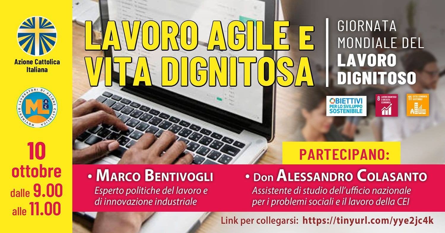 In occasione della Giornata mondiale del lavoro dignitoso, che si celebra il 7 ottobre su iniziativa della Confederazione sindacale internazionale, il Movimento lavoratori di Azione cattolica (Mlac) promuove per sabato 10 ottobre 2020 (dalle ore 9 alle ore 11) il seminario online Lavoro agile e vita dignitosa. La pandemia che ci sta attraversando sta modificando anche i rapporti di lavoro. Nuove modalità del lavoro stanno cambiando il volto delle città e i nostri stili di vita. Parole come smartworking sono ormai entrate nel lessico comune. Definendo condizioni oltre il reale significato: in molti casi più correttamente si dovrebbe parlare di lavoro agile, o di telelavoro o “always on”. Di questo si discuterà con Marco Bentivogli, esperto di politiche del lavoro e relazioni industriali e don Alessandro Colasanto, assistente di studio dell’Ufficio nazionale Cei della Pastorale sociale e del lavoro. Coordina Tommaso Marino, segretario nazionale Mlac.
