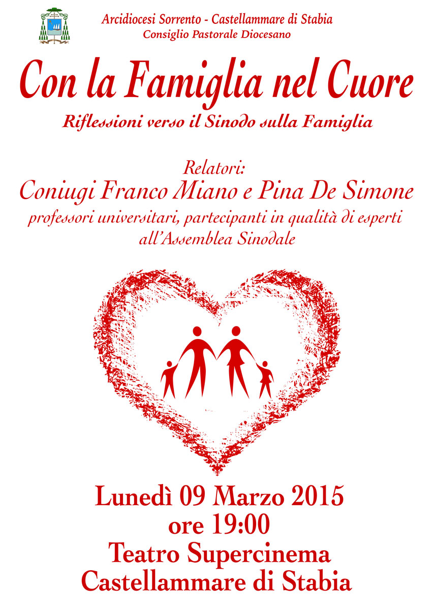 Lappuntamento, il cui sottotitolo è Riflessioni verso il Sinodo sulla famiglia, si terrà lunedì 9 marzo, alle ore 19, nel Teatro Supercinema di Castellammare di Stabia. Relatori saranno i coniugi Franco Miano e Pina De Simone, entrambi professori universitari e partecipanti in qualità di esperti allAssemblea sinodale.