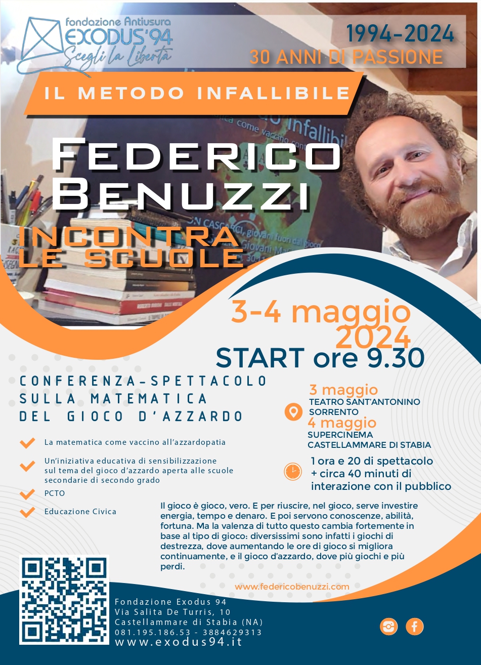 La Fondazione Exodus ’94 festeggia i suoi primi trent’anni in compagnia di Federico Benuzzi, con una conferenza – spettacolo sulla matematica e il gioco d’azzardo rivolta alle scuole.