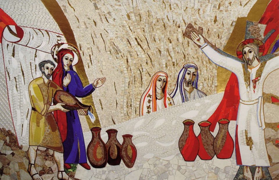 Venuto a mancare il vino, la madre di Gesù gli disse: «Non hanno vino». E Gesù le rispose: «Donna, che vuoi da me? Non è ancora giunta la mia ora». Sua madre disse ai servitori: «Qualsiasi cosa vi dica, fatela».
