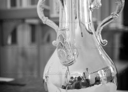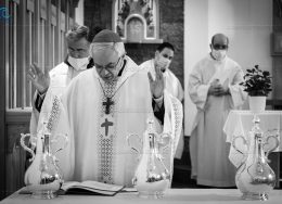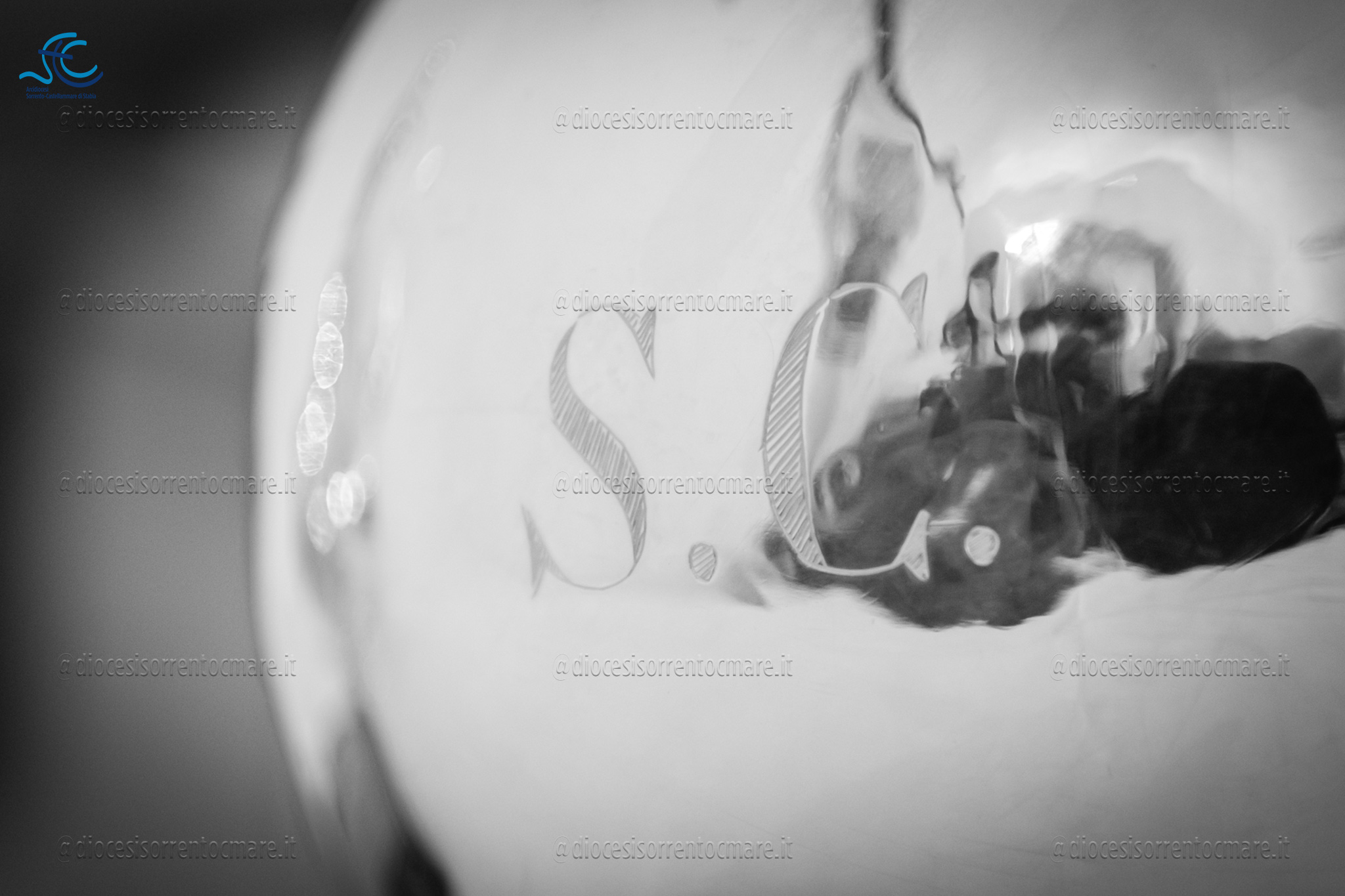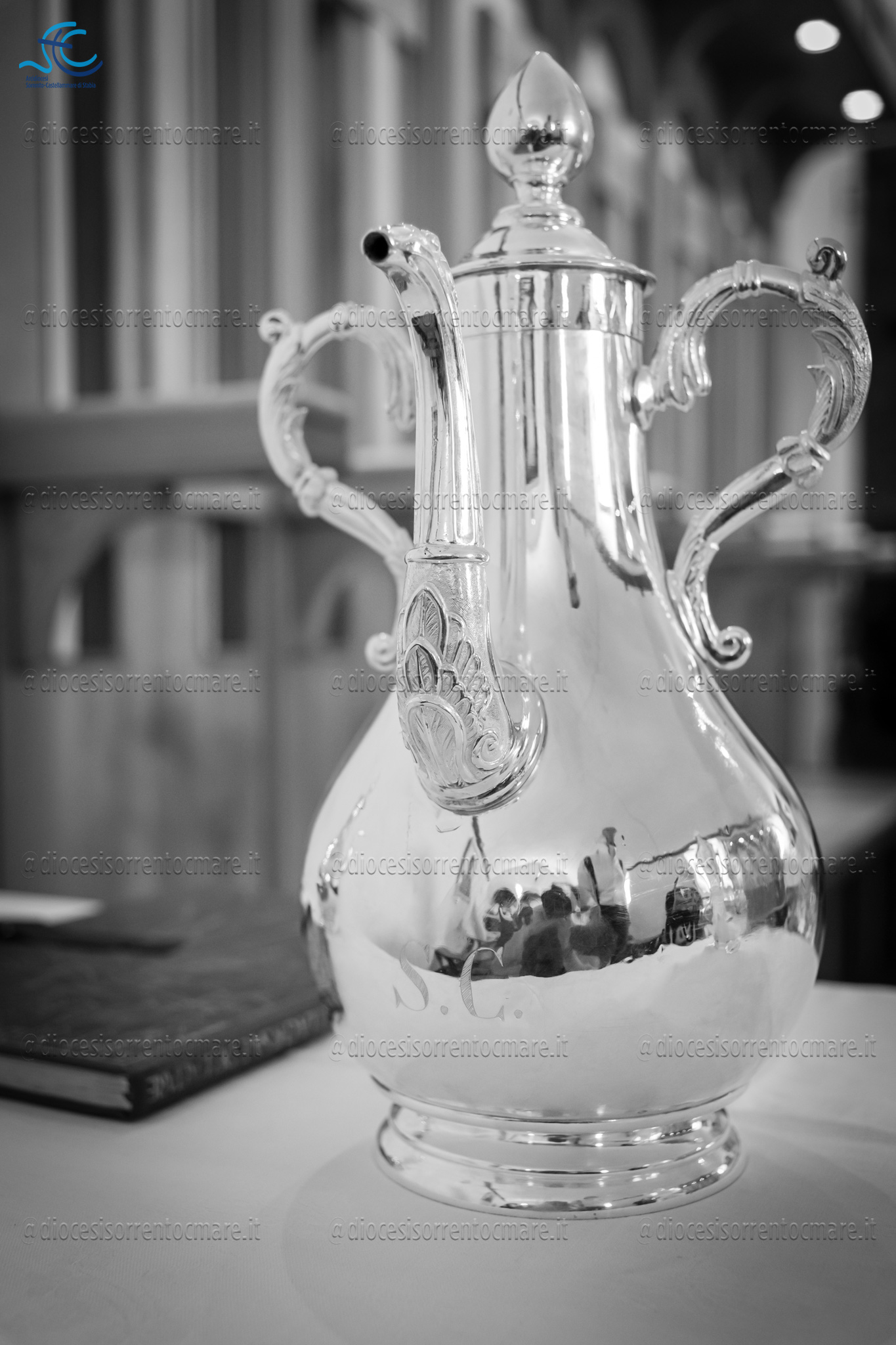 Un’immagine emblematica, che racchiude l’Unità della Chiesa: tre bellissime caraffe custodiscono al loro intero gli Oli Santi, consacrati dal Vescovo Francesco Alfano. Il Crisma (olio misto a profumo), l’olio dei Catecumeni e l’olio degli Infermi.