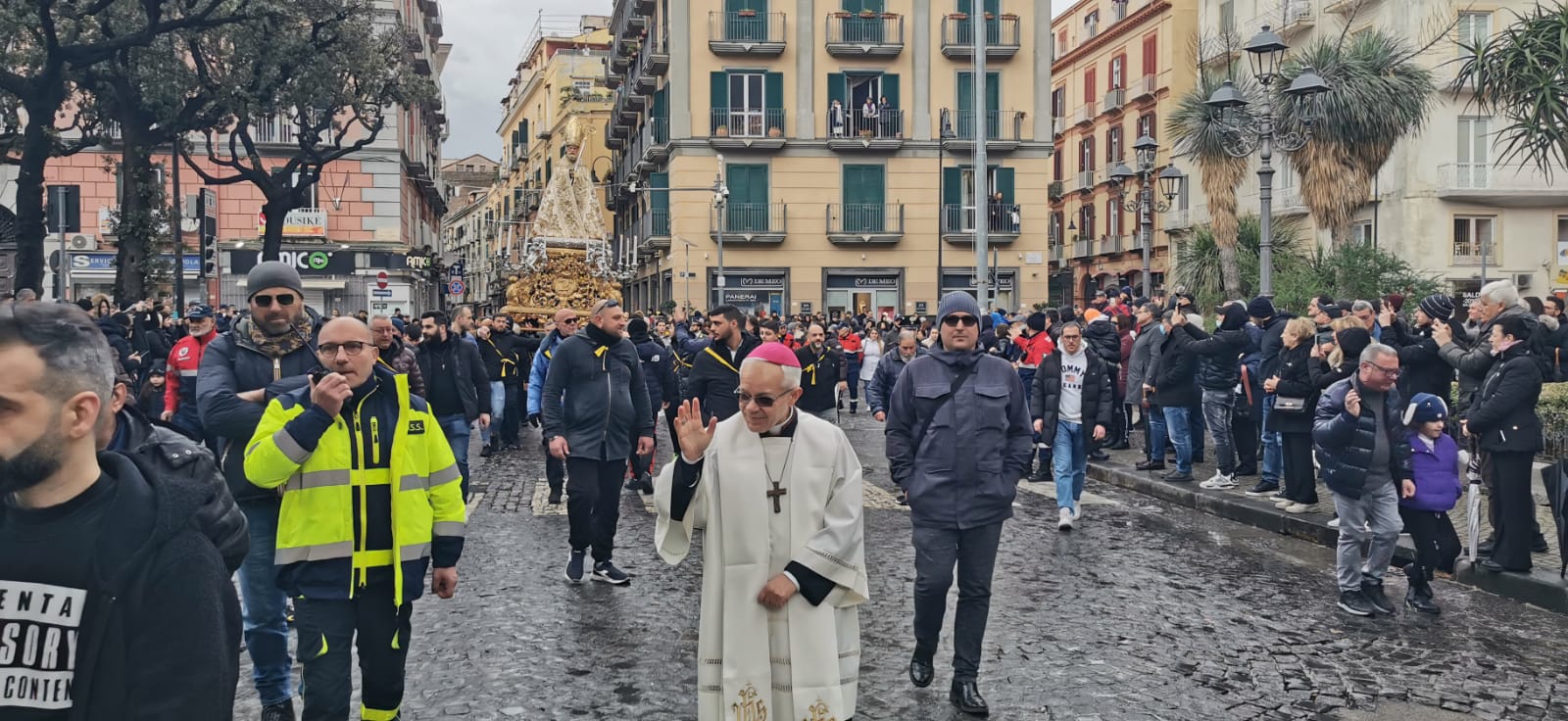 La processione è proseguita nel centro antico della città e come di consueto i fedeli si sono fatti trovare pronti agli angoli delle strade per attendere il santo. “Il suono delle campane ci ricorda il bisogno di riprovarci insieme come famiglia unita. Ogni tanto lungo la strada appariva il sole, quella luce c’è anche quando non si vede e può illuminarci la strada per un futuro migliore. Facciamo tutti la nostra parte, la città deve risorgere con l’intercessione del Santo Patrono e la Benedizione di Dio” – conclude Alfano.