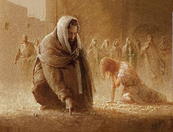Ma Gesù si chinò e si mise a scrivere col dito per terra. Tuttavia, poiché insistevano nell’interrogarlo, si alzò e disse loro: «Chi di voi è senza peccato, getti per primo la pietra contro di lei». E, chinatosi di nuovo, scriveva per terra. Quelli, udito ciò, se ne andarono uno per uno, cominciando dai più anziani.
