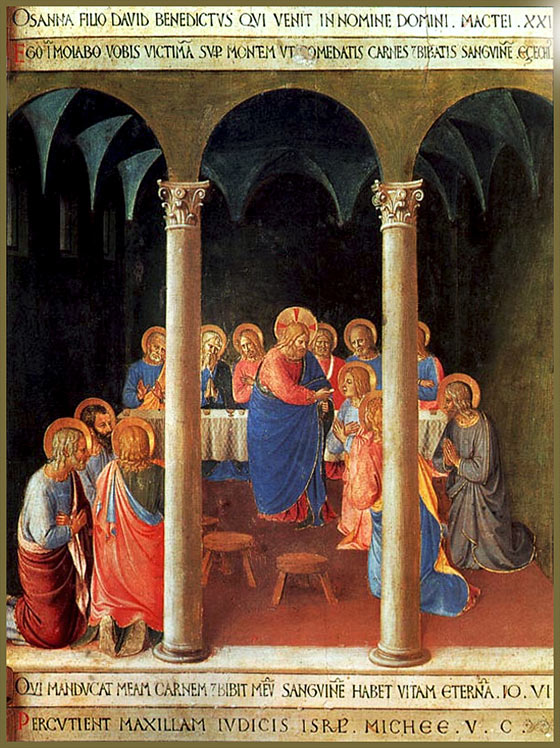 Mentre mangiavano, prese il pane e recitò la benedizione, lo spezzò e lo diede loro, dicendo: «Prendete, questo è il mio corpo». Poi prese un calice e rese grazie, lo diede loro e ne bevvero tutti. E disse loro: «Questo è il mio sangue dell’alleanza, che è versato per molti. In verità io vi dico che non berrò mai più del frutto della vite fino al giorno in cui lo berrò nuovo, nel regno di Dio».