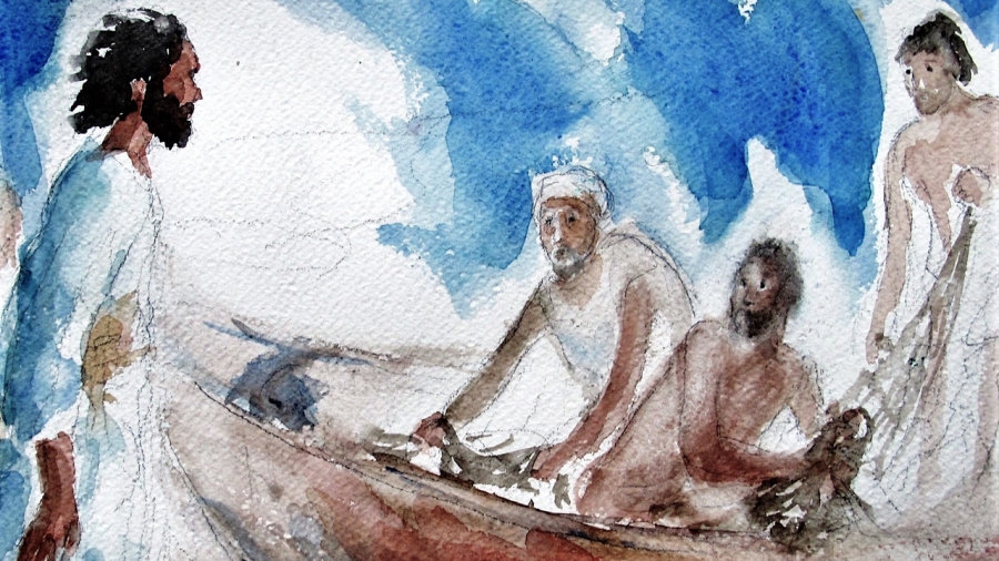 Mentre camminava lungo il mare di Galilea, vide due fratelli, Simone, chiamato Pietro, e Andrea suo fratello, che gettavano le reti in mare; erano infatti pescatori. E disse loro: «Venite dietro a me, vi farò pescatori di uomini». Ed essi subito lasciarono le reti e lo seguirono. Andando oltre, vide altri due fratelli, Giacomo, figlio di Zebedèo, e Giovanni suo fratello, che nella barca, insieme a Zebedeo loro padre, riparavano le loro reti, e li chiamò. Ed essi subito lasciarono la barca e il loro padre e lo seguirono.