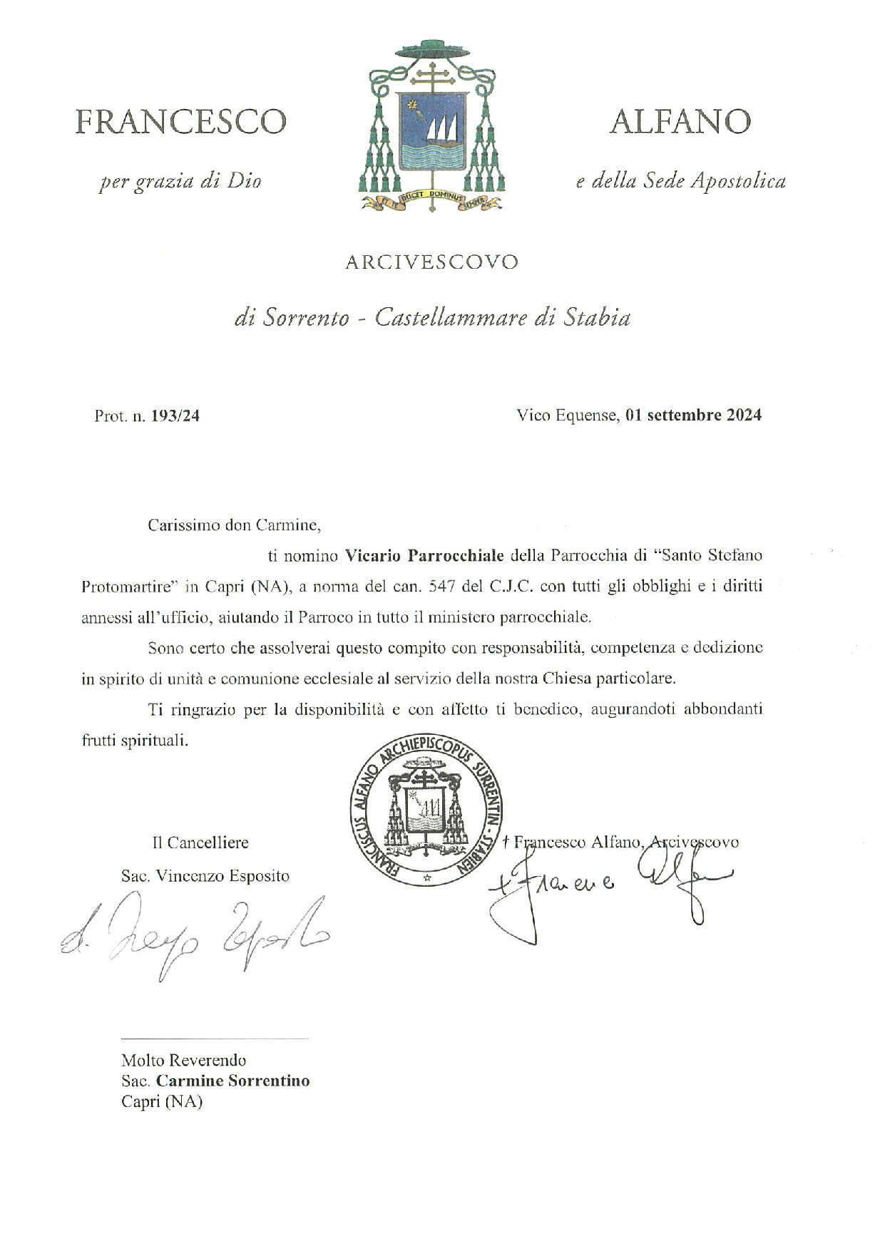 Don Carmine Sorrentino, in data 01 settembre 2024, è stato nominato Vicario Parrocchiale della parrocchia “Santo Stefano Protomartire” in Capri.