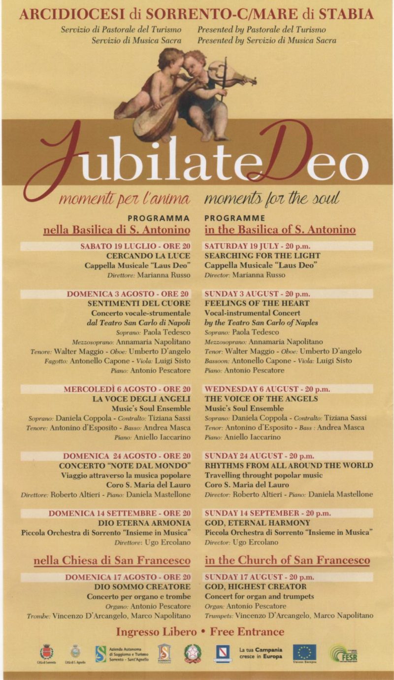 “Jubilate Deo” è il titolo dell’iniziativa promossa quest’estate, dal 19 luglio al 14 settembre, dal Servizio di Pastorale del turismo e dal Servizio di Musica sacra dell’arcidiocesi di Sorrento-Castellammare di Stabia. Si tratta di una serie di concerti – cinque nella basilica di sant’Antonino e uno nella chiesa di san Francesco, a Sorrento – rivolti sia ai fedeli sia ai numerosi turisti, italiani e stranieri, che affollano la Penisola nel periodo estivo. “Non sono momenti liturgici, ovviamente – spiega don Luigi Di Prisco, rettore della basilica di sant’Antonino e responsabile del Servizio di Pastorale del turismo – perché ci sono tanti non credenti tra i turisti, ma sono sicuramente dei momenti per rinfrancare l’anima, anche grazie ai luoghi dove sono ospitati i concerti”.
