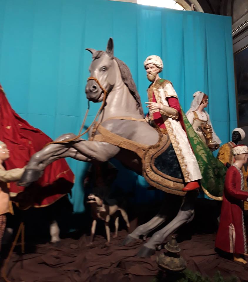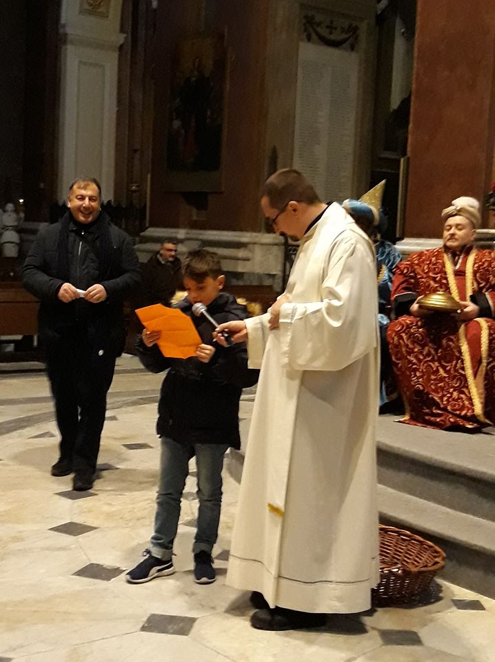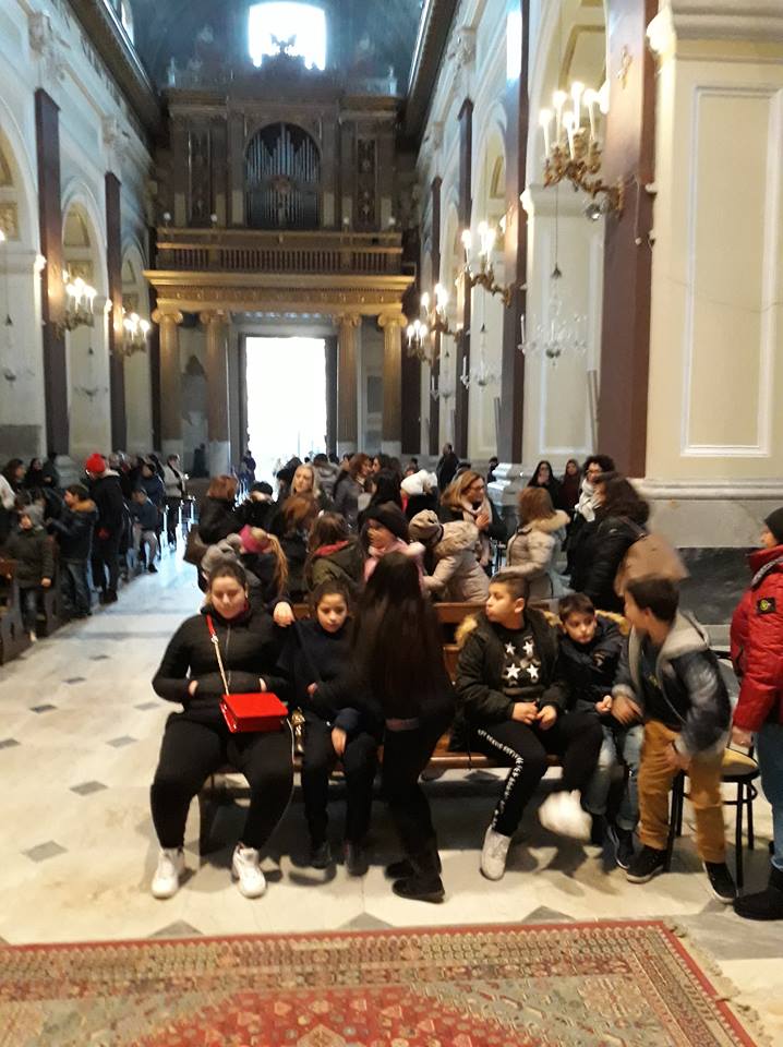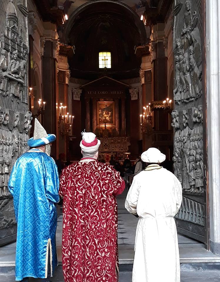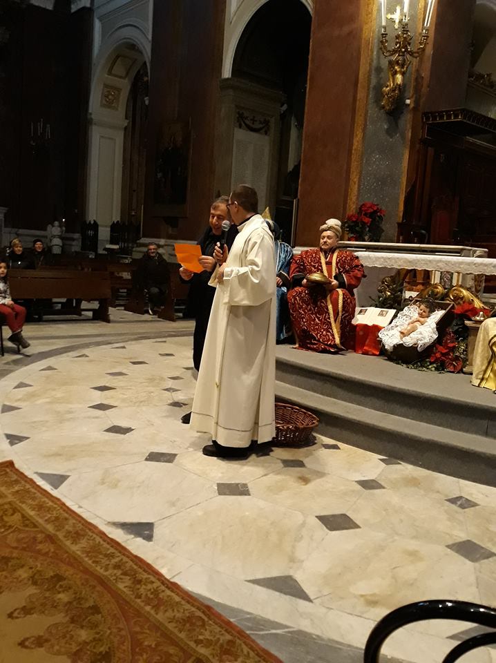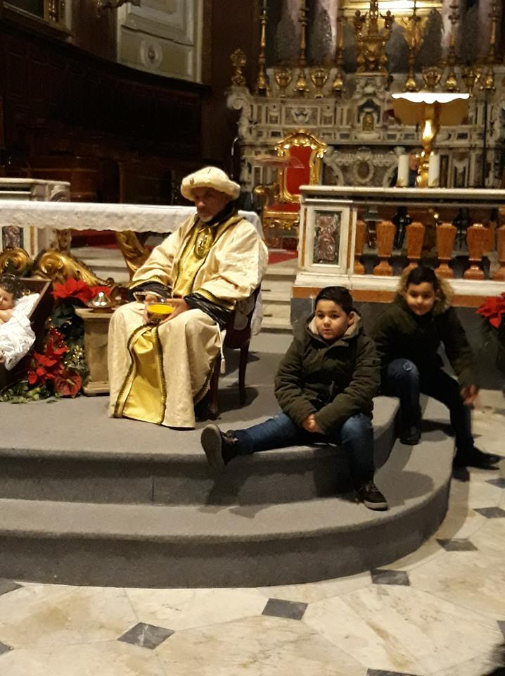 Appena arrivati i Re hanno lasciato i cavalli e hanno aspettato davanti la Porta Santa che i piccoli, dopo aver visitato il Monumentale presepe allestito nella Duomo ,prendessero posto e uno ad uno sono entrati invitati da don Salvatore Abagnale che li ha presentati ai bambini e poi ha letto loro il Vangelo di Mt.2,1-12.