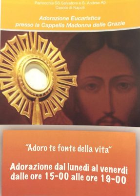 L’Eucaristia è descritta nella costituzione dogmatica del Concilio Vaticano II Sacrosantum Concilium come fonte e culmine della nostra fede; impegnarsi in un’adorazione regolare con cuore aperto può avere risultati sorprendenti. Sulla base di questo pensiero, il nostro parroco don Raffaele, insieme al gruppo anziani ha ritenuto fosse cosa buona esporre il Santissimo Sacramento ogni giorno nella cappella Madonna delle Grazie al fine di permettere ai fedeli di poter trascorrere del tempo in preghiera in intimo contatto con Cristo.