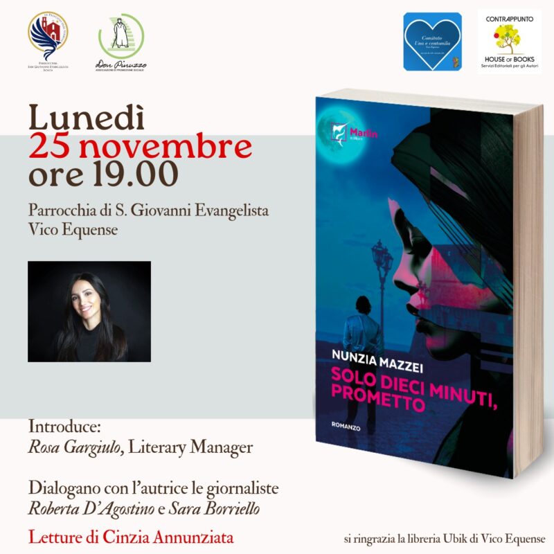 Il 25 novembre, in occasione della Giornata Internazionale per l’eliminazione della violenza contro le donne, a Vico Equense (Na) si terrà la presentazione del romanzo di Nunzia Mazzei – “Solo dieci minuti, prometto”. L’evento è organizzato dalla parrocchia di San Giovanni Evangelista – in località Bonea, guidata da don Mario Cavaliere, e dall’Associazione Don Pinuzzo, con il sostegno del Comitato Una e centomila e dell’agenzia letteraria Contrappunto House Of Books.