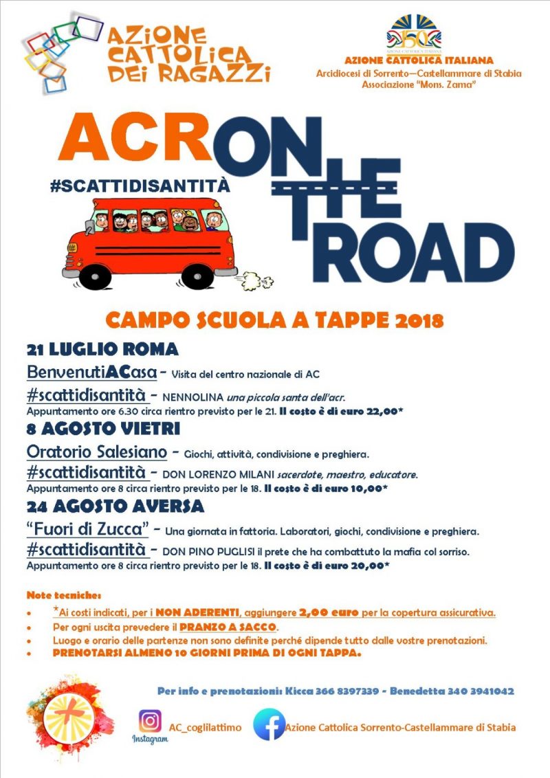 Durante il campo-scuola a tappe scopriremo come possiamo sperimentare la Santità ogni giorno, impareremo ad essere Santi nella nostra quotidianità, in famiglia, a scuola, nei luoghi di lavoro. Per questo motivo sarebbe auspicabile partecipare a tutte e tre le tappe, ma ci rendiamo conto che i mesi estivi sono contrassegnati dalle vacanze; quindi per chi potesse partecipare ad una sola o a due tappe, verrà accolto con gioia ugualmente. Certi della vostra attenzione e affezione all’AC, vi mandiamo un grande abbraccio e attendiamo notizie sulla vostra partecipazione. 1, 2, 3, 4, 5, 6, CIAO!