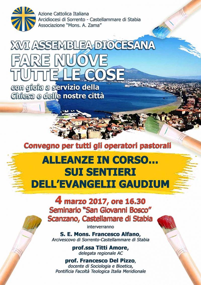 Sabato 4 marzo presso il Seminario “San Giovanni Bosco” di Scanzano vi sarà un Convegno aperto a tutti gli operatori dal titolo: “Alleanze in Corso… sui sentieri dell’Evangelii Gaudium” interverrano S.E. Mons. Francesco Alfano Arcivescovo di Sorrento-Castellammare di Stabia, prof.ssa Titty Amore delegata regionale AC, prof. Francesco Del Pizzo docente di Sociologia e Bioetica presso la Pontificia Facoltà Teologica dell’Italia Meridionale. Il tema proposto si inserisce nel cammino pastorale della nostra Chiesa locale invitata dallArcivescovo a “lasciarsi guidare dalla Evangelii Gaudium per un ripensamento missionario della pastorale ordinaria”.