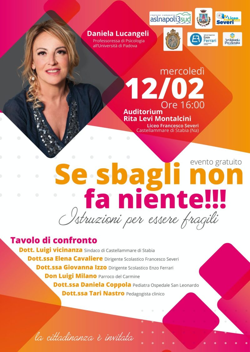 Con il patrocinio morale dell’ASL Napoli3Sud e del Comune di Castellammare di Stabia Mercoledì 12 FEBBRAIO ore 16.00 presso l’auditorium Rita Levi Montalcini, Liceo Francesco Saveri Castellammare di Stabia “Se sbagli non fa niente. Istruzioni per essere fragili”.