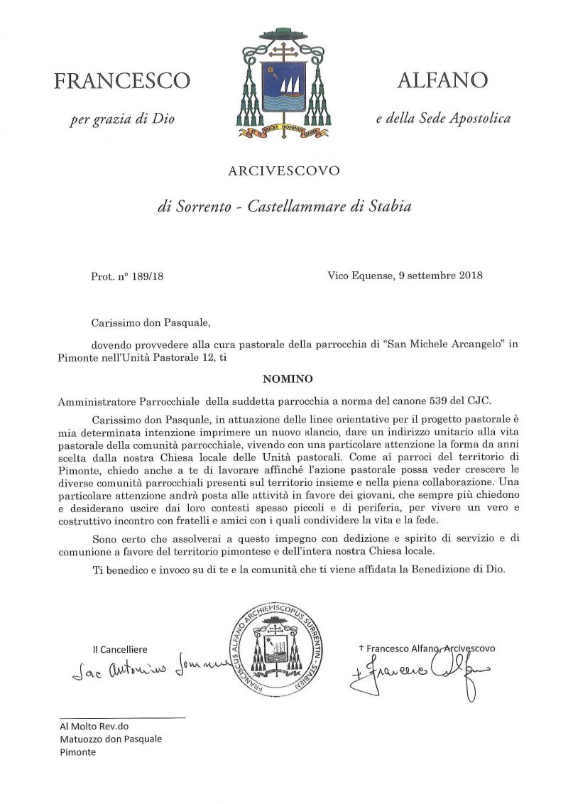 Don Pasquale Matuozzo, in data 09 settembre 2018, è stato nominato Amministratore Parrocchiale per la Parrocchia San Michele Arcangelo – Pimonte