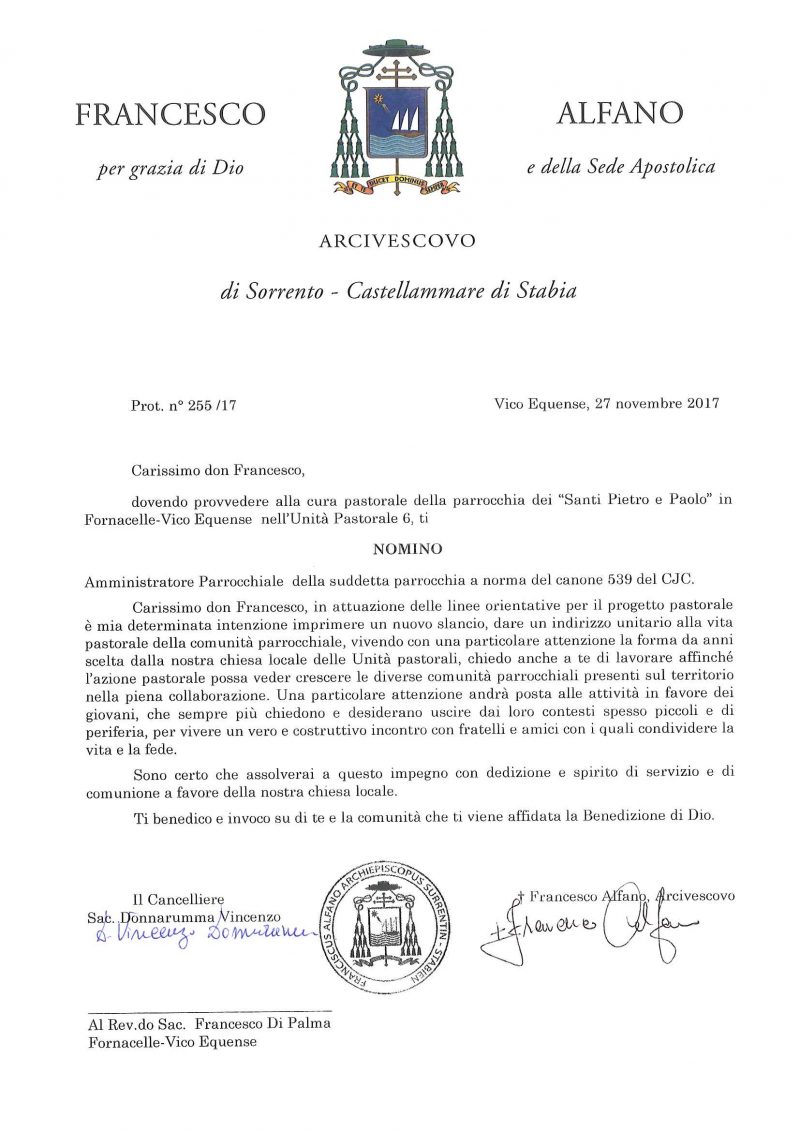 Don Francesco Di Palma, in data 27 novembre 2017, è stato nominato Amministratore Parrocchiale della parrocchia Santi Pietro e Paolo in Fornacelle Vico Equense.