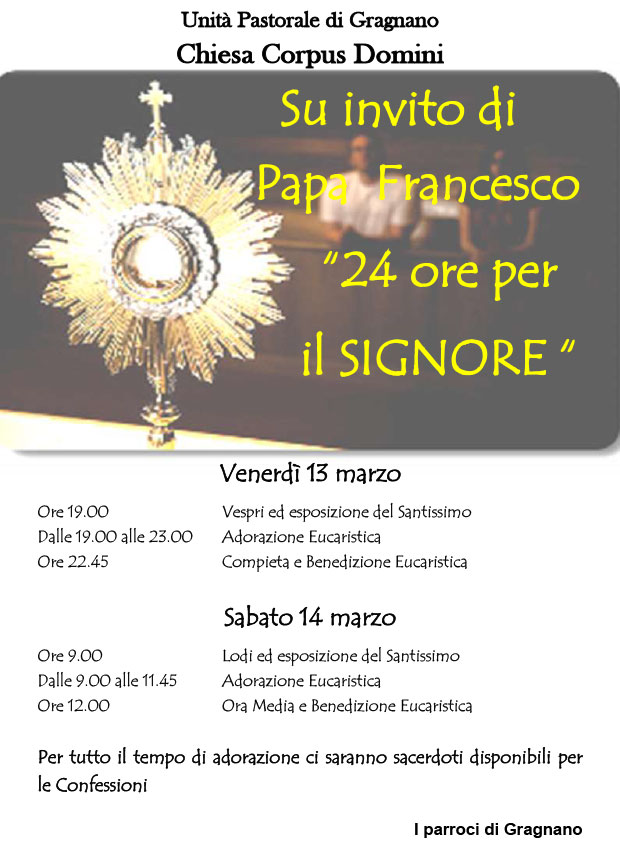 LUnità pastorale 13 (Gragnano) promuove venerdì 13 marzo, alle ore 19, i Vespri ed esposizione del Santissimo; dalle 19 alle 23 Adorazione eucaristica; alle ore 22.45 Compieta e Benedizione eucaristica. Sabato 14 marzo, alle ore 9, Lodi ed esposizione del Santissimo; dalle 9 alle 11.45 Adorazione eucaristica; alle ore 12 Ora Media e Benedizione eucaristica. Per tutto il tempo di adorazione ci saranno sacerdoti disponibili per le confessioni.