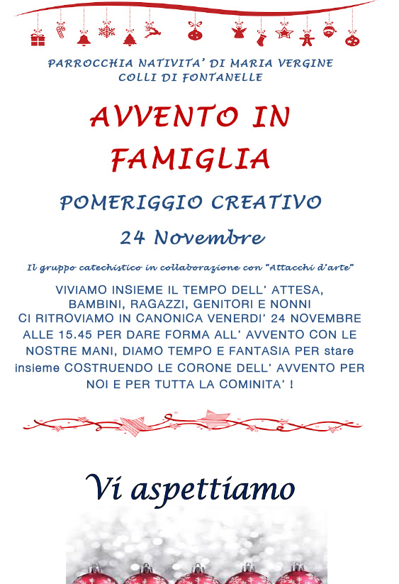 Un occasione per mostrare la bellezza dellamore, solleciteremo i ragazzi ad accorgersi delle persone che dimostrano di volere il loro bene, primi fra tutti i genitori, i nonni, i familiari, capaci di cercare e donare amicizia. È questo un modo importante per aiutare i ragazzi a discernere, a comprendere che in ogni loro scelta possono contare su un aiuto e su un accompagnamento. Da questa idea nasce il Pomeriggio creativo , che vedrà coinvolte intere famiglie impegnate a creare le corone dell avvento. Il gruppo catechistico, gli animatori, il team del gruppo Attacchi darte e il gruppo di Pastorale familiare insieme ai bambini, ai ragazzi, ai genitori e ai nonni, in un unica grande famiglia si dedicheranno a realizzare le proprie opere darte, chiacchierando del tempo d avvento, vivendo l attesa immergendosi in un tempo comunitario. Papa Francesco stesso chiede a noi cristiani di uscire ed ESSERE REGALO. Uscire dunque con fiducia per stare in mezzo alla gente, costruire relazioni positive, imparare da chi incontriamo lungo le strade della vita, generare e costruire umanità, la chiesa vissuta così diventa luogo formativo delluscire, del prendersi cura e dellaccompagnare la vita nella modalità del farsi dono.