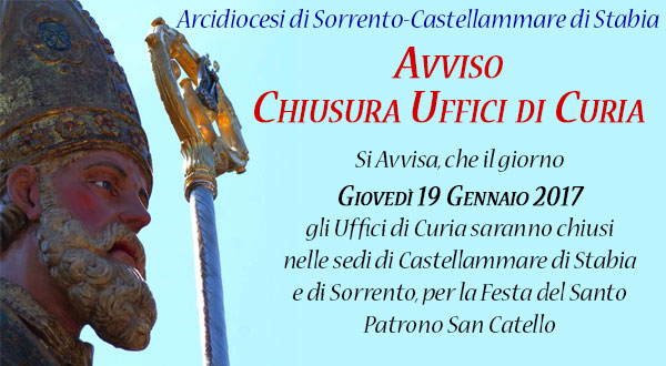 news diocesane 5 Gennaio 2017 Avviso chiusura Uffici di Curia Si Avvisa, che il giorno Giovedì 19 Gennaio 2017 gli Uffici di Curia saranno chiusi nelle sedi di Castellammare di Stabia e di Sorrento, per la Festa del Santo Patrono San Catello. FacebookWhatsappGoogleTwitterLinkedinEmailPrint