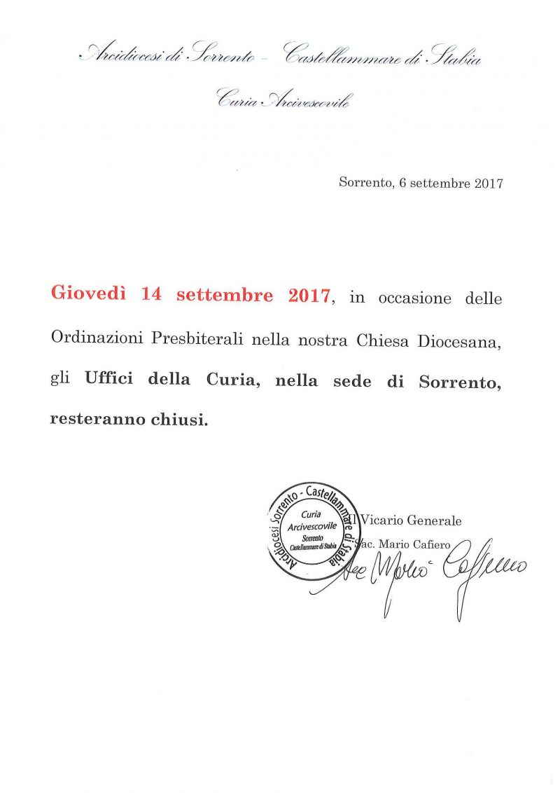 Giovedì 14 settembre in occasione delle Ordinazioni Presbiterali nella nostra Chiesa Diocesana, gli Uffici della Curia, nella sede di Sorrento resteranno chiusi.