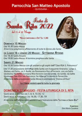 “Il programma liturgico avrà inizio domenica 15 maggio, con la Santa Messa daremo il via alla Settimana Ritiana scandita da diversi appuntamenti. Una particolare tappa è prevista sabato 21 maggio, si svolgerà la Santa Messa presso la Chiesa di San Francesco con gli anziani e gli ospiti dell’Oasi RSA S.Francesco, al pomeriggio si proseguirà con la processione dell’effige della Santa. Domenica 22, invece, vivremo la Festa liturgica di Santa Rita da Cascia con diverse celebrazioni al mattino e alla sera” – conclude Don Mario Cavaliere.