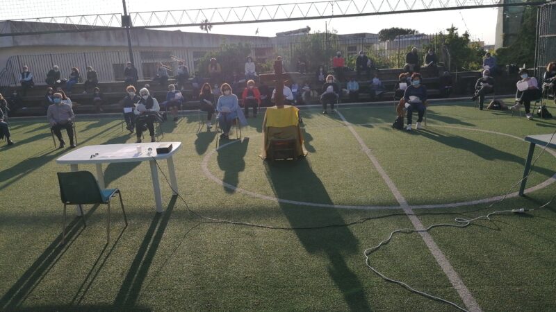 suo triplice tradimento, la domanda: Mi ami tu più di costoro? E’ quasi sera, ormai, nel giardino parrocchiale, e i colori del tramonto accendono il cielo sopra il campetto, ma questo tramonto è diverso, sembra non voler essere l’annuncio di una nuova notte, ma piuttosto un invito alla Speranza. L’incontro allora si trasforma in preghiera, siamo nel mese di maggio e la preghiera non può che essere il Santo Rosario, forse il modo più bello per cominciare a rispondere a quella domanda che Gesù stasera ha rivolto a ciascuno di noi. Quella domanda che inizia con un verbo statico, mi ami, al quale però fanno seguito una serie di verbi dinamici, pasci i miei agnelli, pascola le mie pecore, e, ultimo ma non l’ultimo, Seguimi! Ed è con questo invito si traduce per noi in invito all’annuncio gioioso del Vangelo, che alla spicciolata, così come siamo venuti (abbracci, baci e chiacchiere amichevoli saranno vietati ancora per un po’!) lasciamo il “nostro” giardino parrocchiale. E’ stato bello rivedersi! Abbiamo fatto esperienza della gioia di Gesù Risorto!