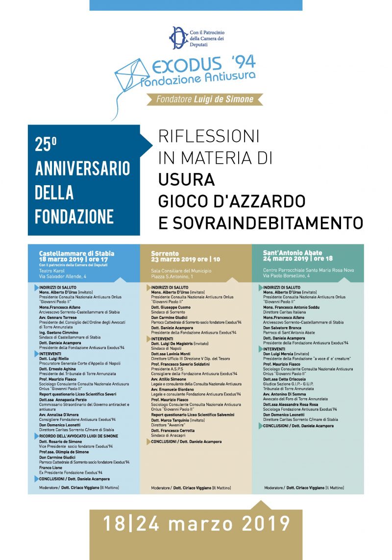 Nel 2021 la Fondazione antiusura Exodus ’94, legata e sostenuta dall’arcidiocesi di Sorrento Castellammare di Stabia, è intervenuta su più di 100 casi, con oltre 300mila euro. Di questi ben 55 hanno riguardato giocatori d’azzardo patologici, 31 indebitati con finanziarie o parenti, 24 già finiti in mano agli usurai. «Questo è quello che dicono – ci spiega il presidente della Fondazione, Daniele Acampora –. Magari … Continue reading “Un percorso di un anno per salvarli”, la sfida di Exodus a Castellammare di Stabia
