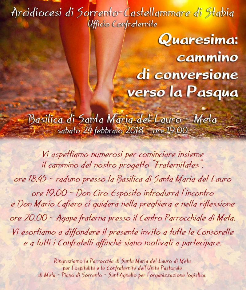 Cos’è? E’ un “cammino” dedicato alla preparazione dell’Incontro di Quaresima che si svolgerà il 7 marzo p.v. nella Cattedrale dei Santi Filippo e Giacomo di Sorrento. Come è nato il progetto? Il progetto è nato all’indomani dell’esperienza fatta al Cammino Nazionale delle Confraternite d’Italia di Matera. In tale occasione un coro formato da consorelle e confratelli dei nostri Sodalizi ha rappresentato la tradizione musicale della … Continue reading Segni, gesti, parole e musica per un tempo di conversione