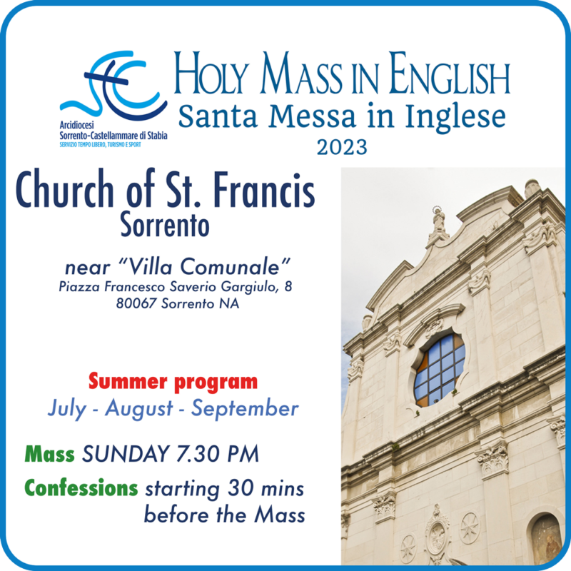 Ritorna la messa in inglese, presso la chiesa dei Padri Francescani di Sorrento. L’iniziativa, realizzata in sinergia con la Pastorale del Turismo, offre la possibilità, ai tanti turisti che arrivano nella nostra terra, della celebrazione e della confessione. Tutte le domeniche dei mesi di luglio, agosto e settembre, è in programma la Santa Messa alla ore 7:30, mezz’ora prima della celebrazione sono previste le confessioni. … Continue reading Sorrento. Ritorna la messa in inglese presso la Chiesa dei Padri Francescani