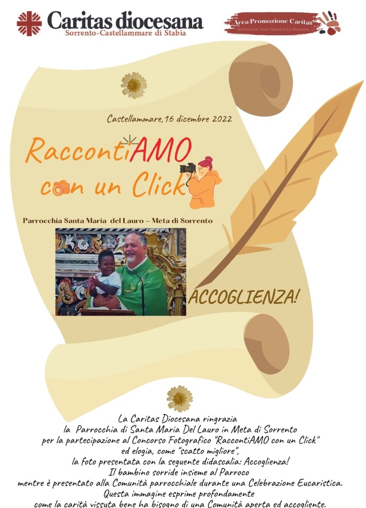 Ringrazio tutte le Caritas parrocchiali e Associazioni caritative che hanno partecipato al concorso fotografico “RaccontiAMO con un Click” organizzato dalla nostra Caritas Diocesana. La premiazione della foto vincitrice è avvenuta in Caritas Diocesana il 16 dicembre durante il ritiro in preparazione al Natale. Abbiamo scelto ed elogiato come “scatto migliore” una foto inviata dalla Parrocchia di Santa Maria del Lauro in Meta di Sorrento. Vi … Continue reading Foto vincitrice RaccontiAmo con un click