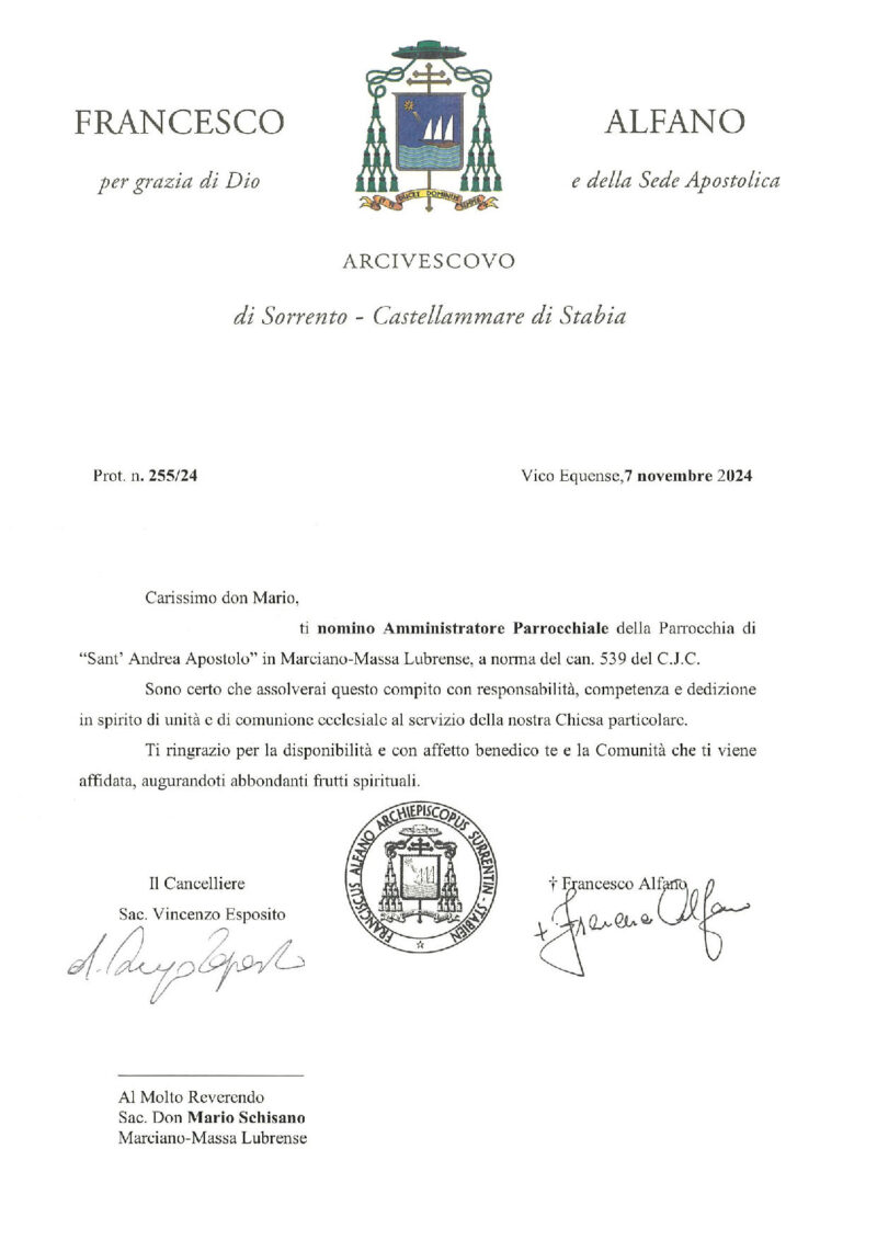 Don Mario Schisano, in data 07 novembre 2024, è stato nominato Amministratore Parrocchiale della parrocchia Sant’Andrea Apostolo, Marciano in Massa Lubrense.