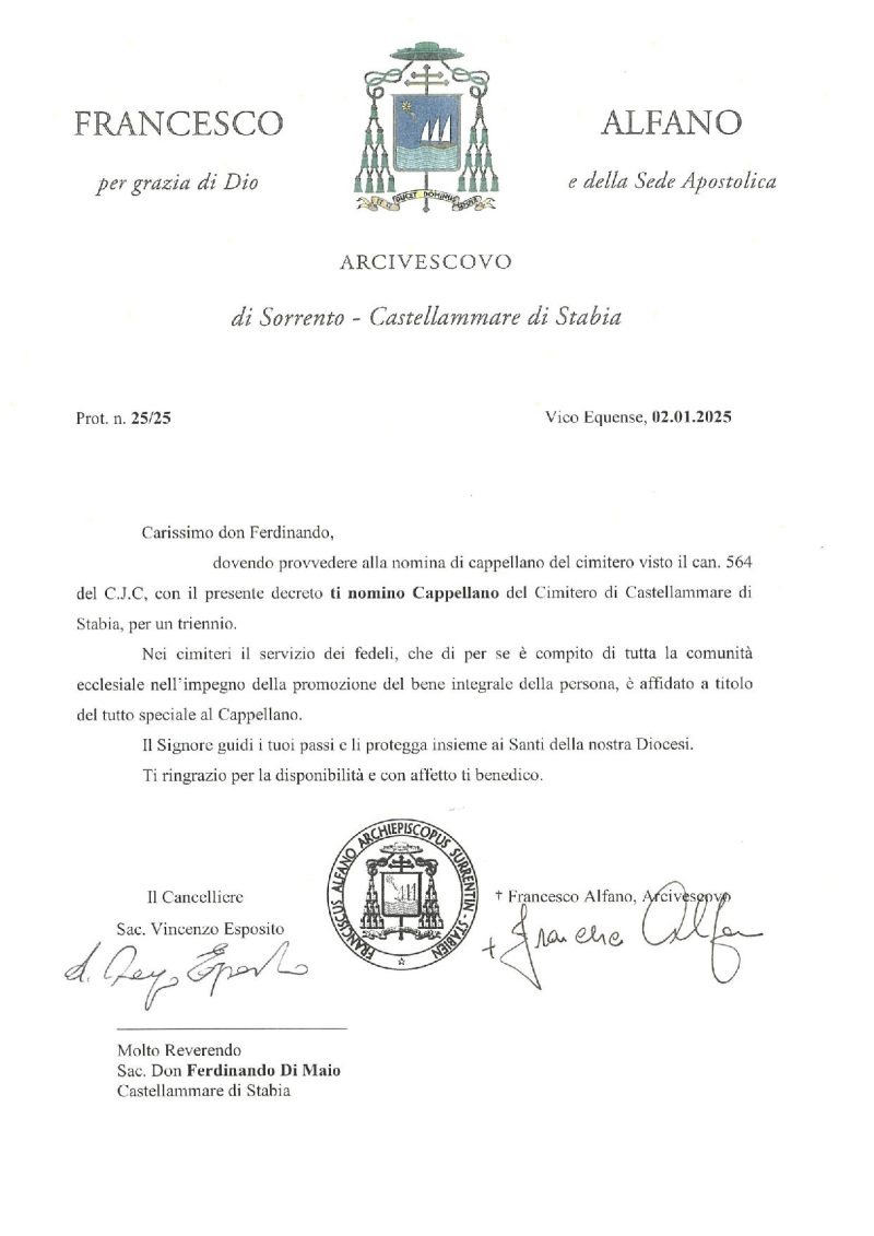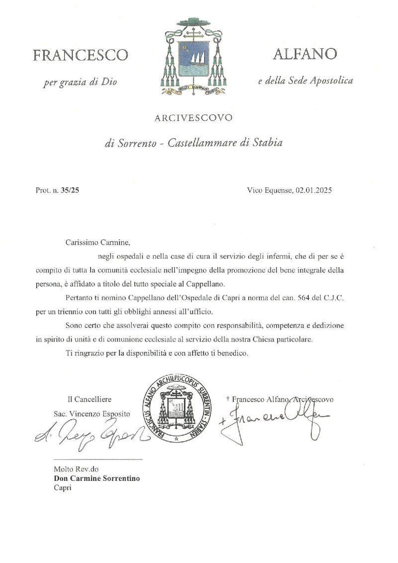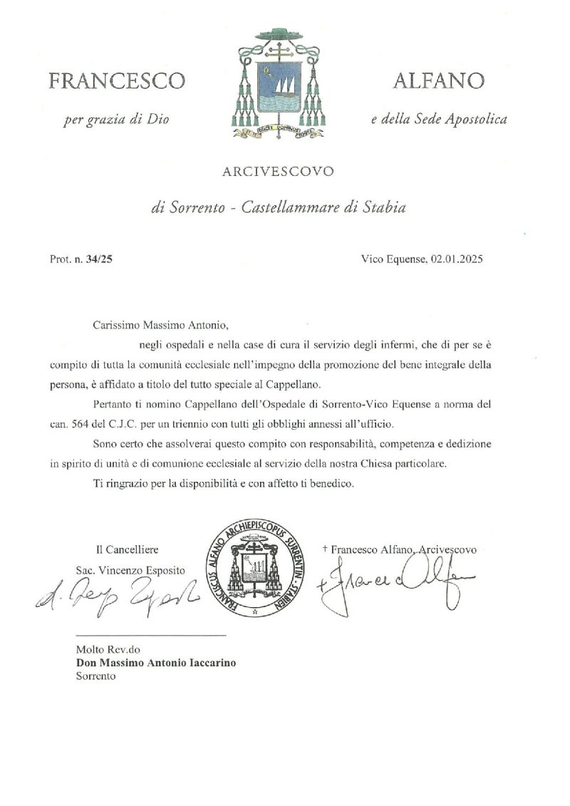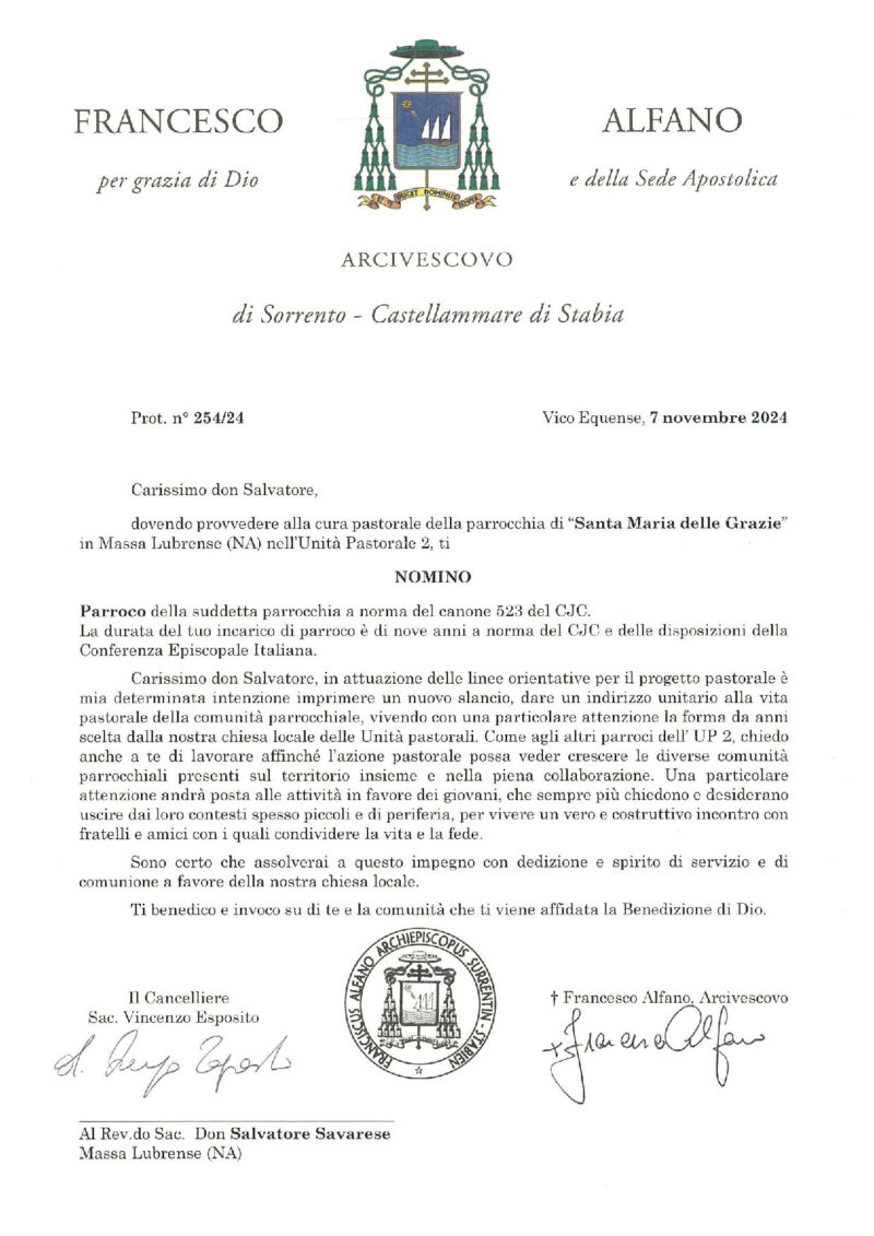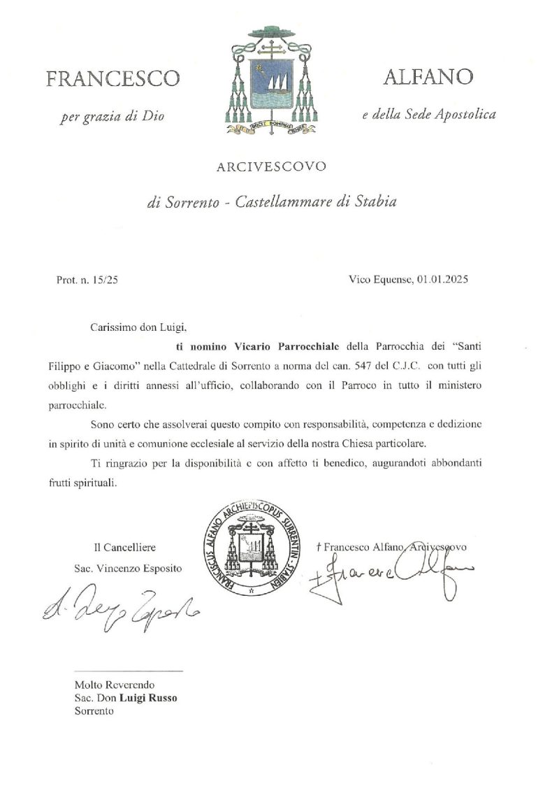 Don Massimo Antonio Iaccarino, in data 08 dicembre 2024, è stato nominato Amministratore Parrocchiale della parrocchia Sant’Attanasio Vescovo, Priora in Sorrento.