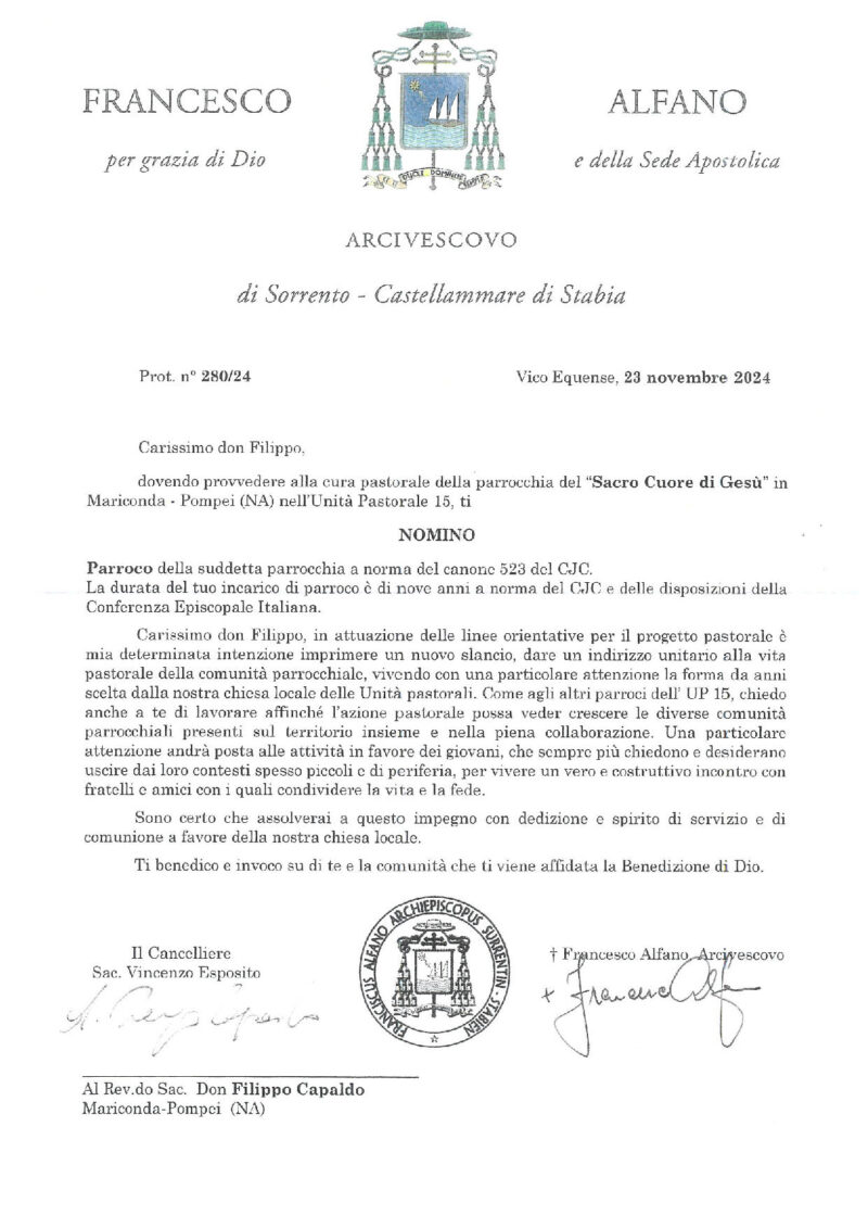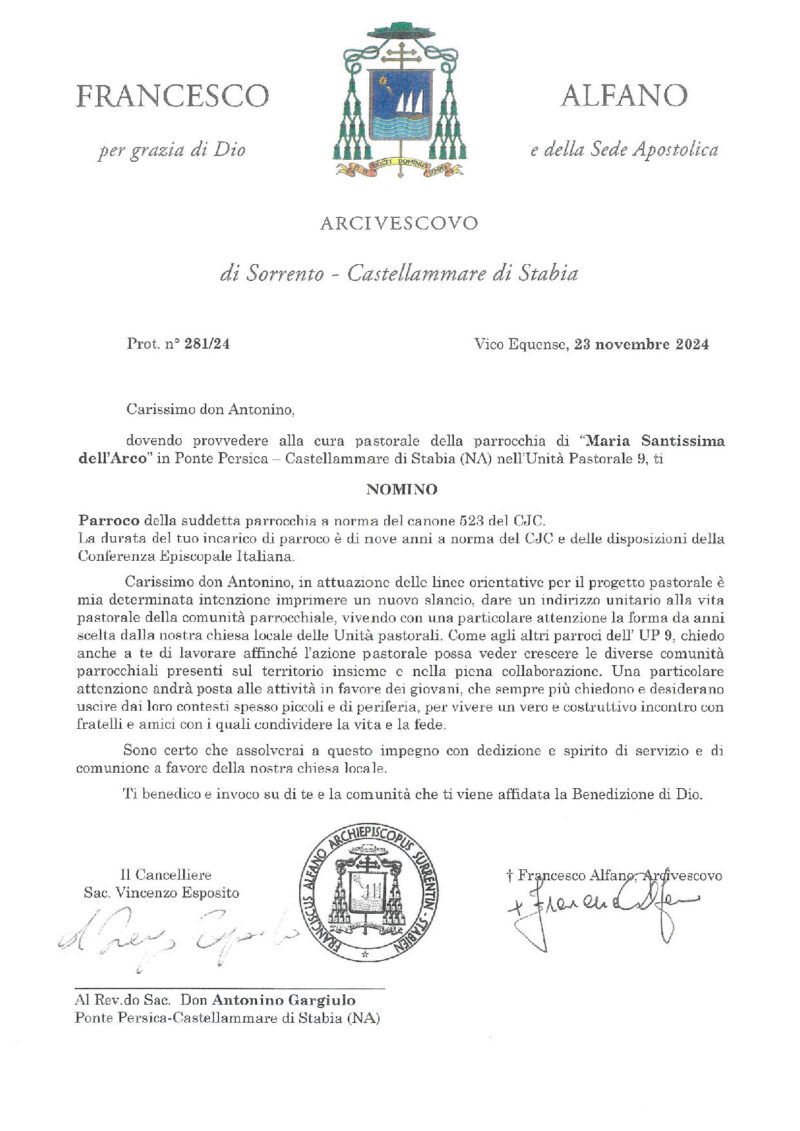 Don Antonino Gargiulo, in data 23 novembre 2024, è stato nominato Parroco della parrocchia “Maria Santissima dell’Arco” a Ponte Persica in Castellammare di Stabia.