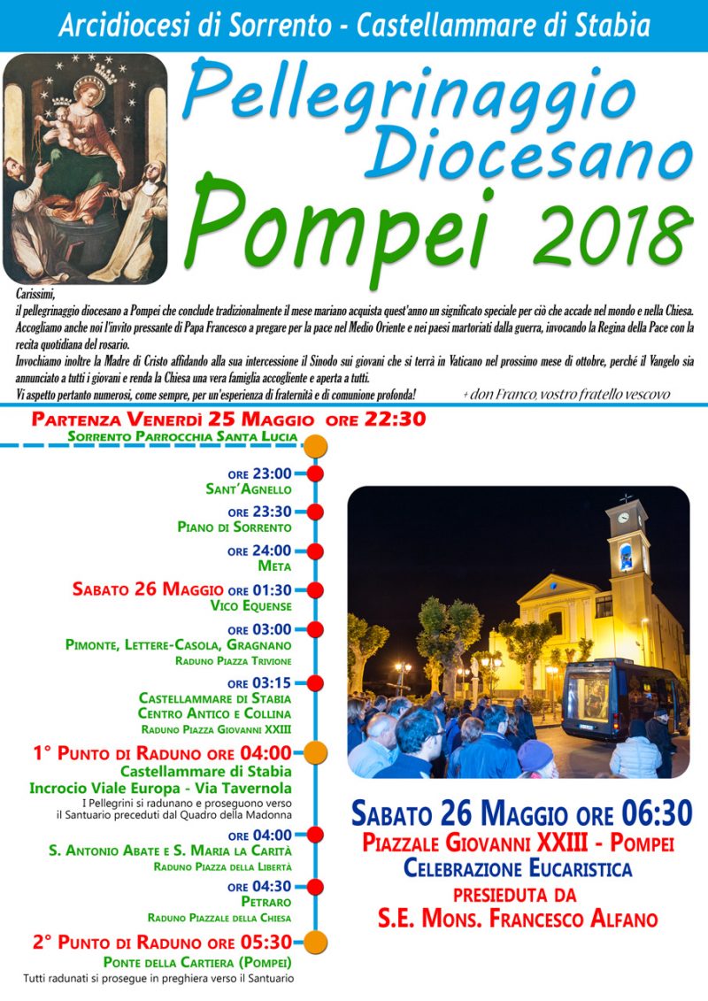 Stesso posto, stessa ora. Ritorna come ogni anno l’appuntamento che raduna centinaia di pellegrini di tutta la diocesi, prontissimi a vivere il Pellegrinaggio Diocesano Pompei 2018. A partire dalle ore 22.30 di venerdì 25, il punto di partenza sarà dalla Parrocchia di Santa Lucia di Sorrento per poi iniziare il cammino tra preghiere e canti, animando con gioia e spirito di fede il percorso verso … Continue reading Pellegrinaggio Diocesano Pompei 2018: in cammino per la pace