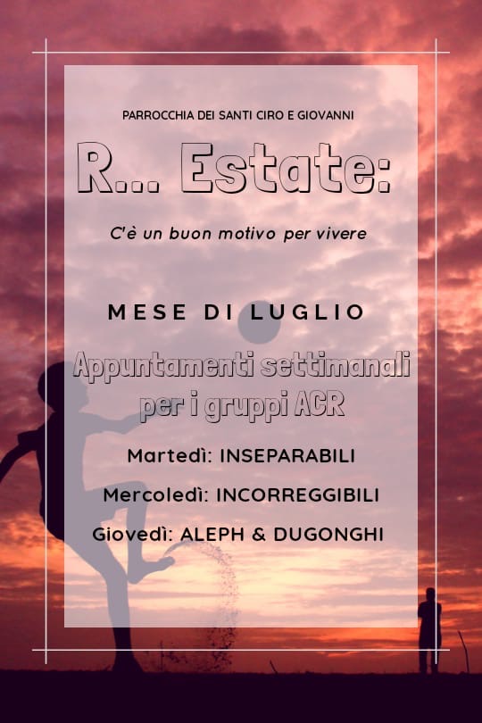 Anche per i giovanissimi l’estate non ferma il desiderio di incontrarsi, certo in modalità differente dal solito, senza l’attesissimo campeggio, ma gli educatori nelle scorse settimana anche loro hanno immaginato e programmato una bellissima avventura, forse questo mese oltre ad essere occasione d’incontro, sarà anche opportunità per andare alla riscoperta della nostra terra, così bella e benedetta. Mercoledì dopo mercoledì saranno tanti i motivi per vivere, e vivere al meglio!