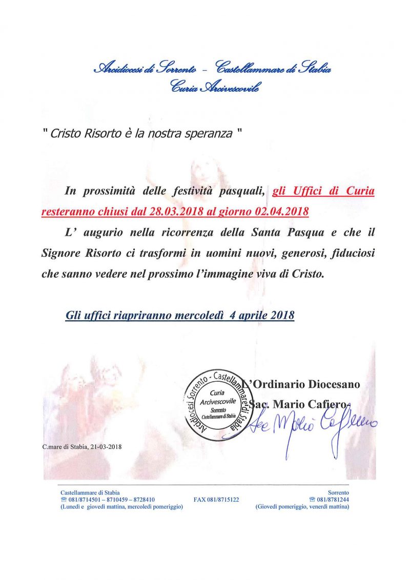 In prossimità delle festività pasquali, gli Uffici di Curia resteranno chiusi dal 28.03.2018 al giorno 02.04.2018